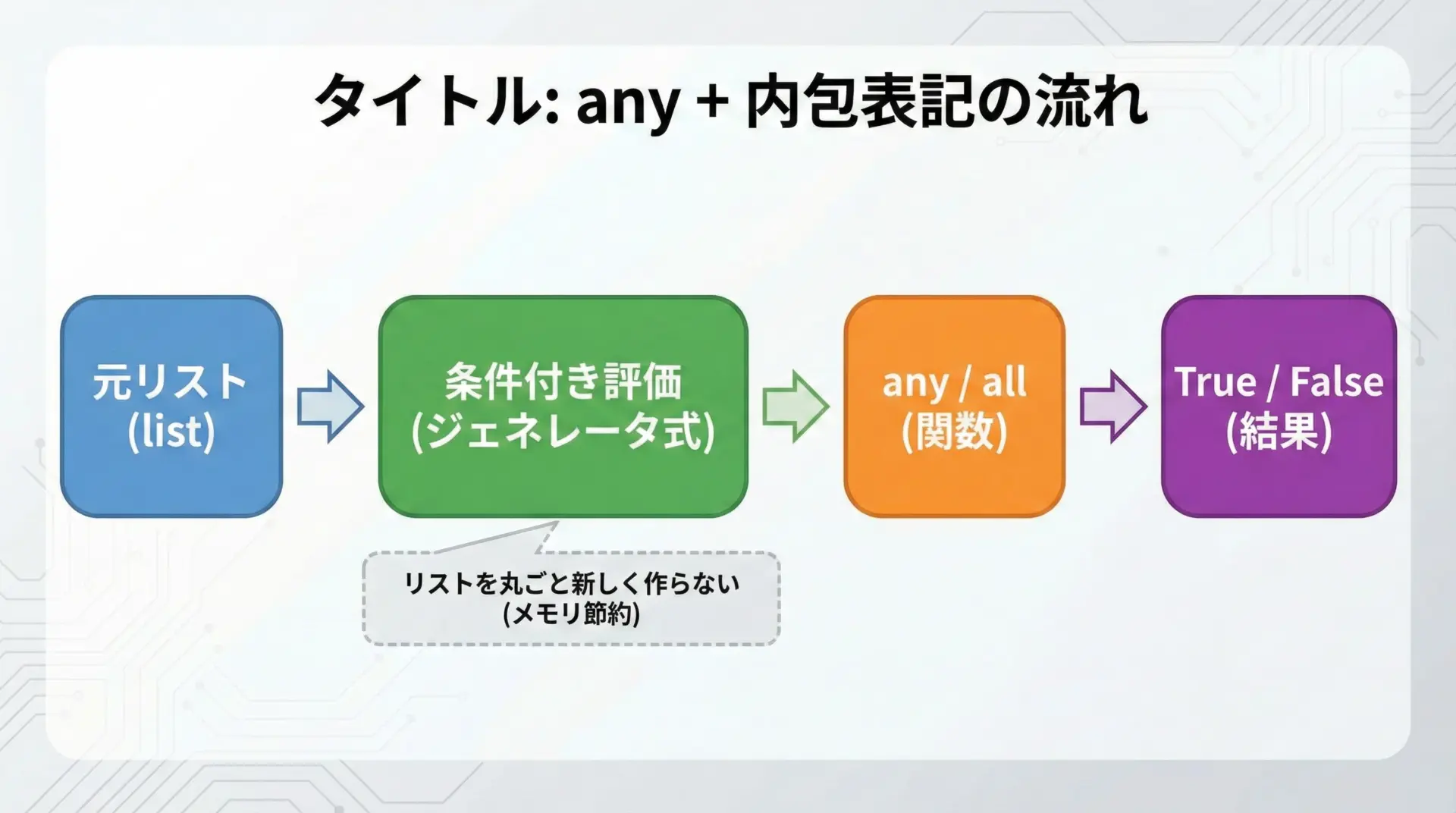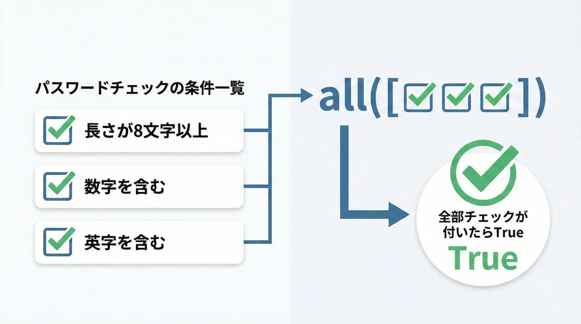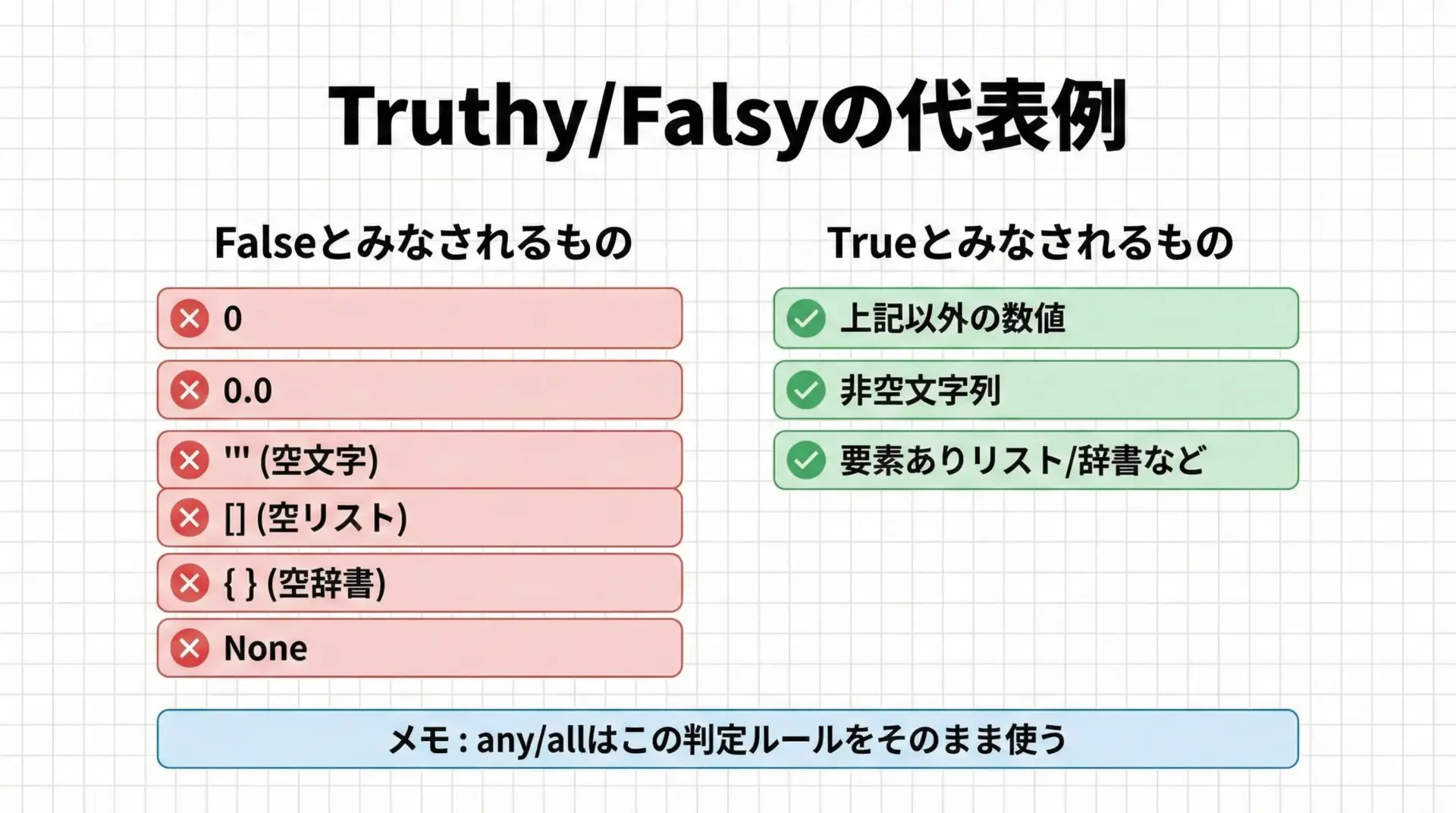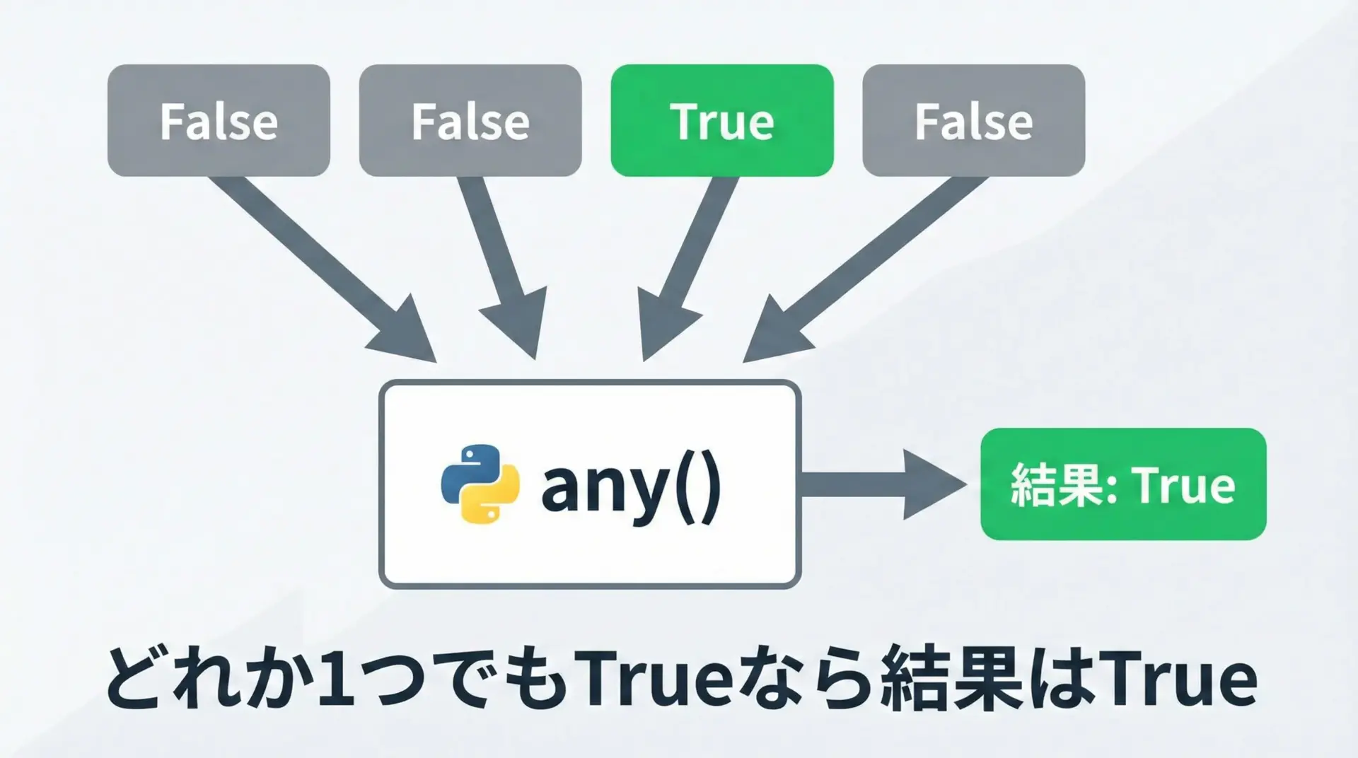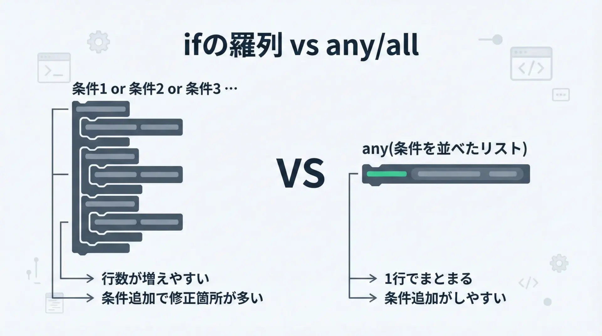 条件の種類が増えたとき、論理演算子でつなぐよりも、any/allに真偽値のリストを渡す方が、一覧性と拡張性が高いことが分かります。
