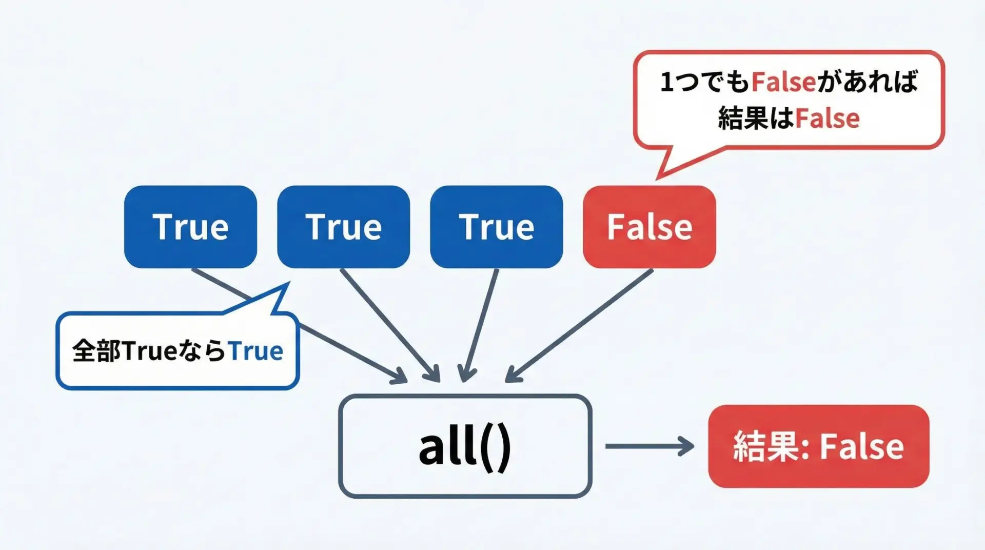 イテラブルの中の要素がすべて真である場合にTrueを返し、1つでも偽が混ざっていればFalseを返します。