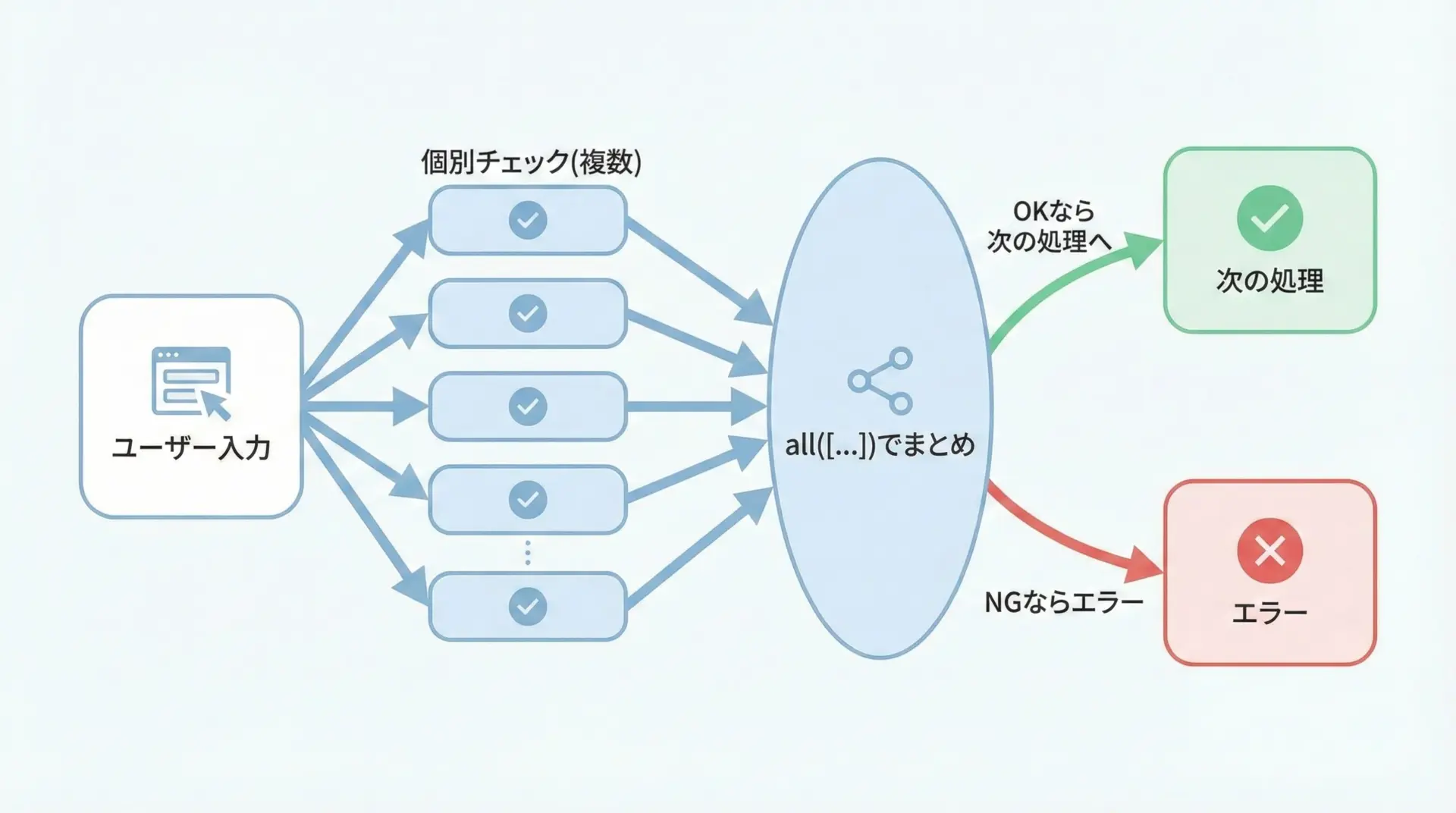 # エラーリストが空であることをallに含めて判定しているイメージ