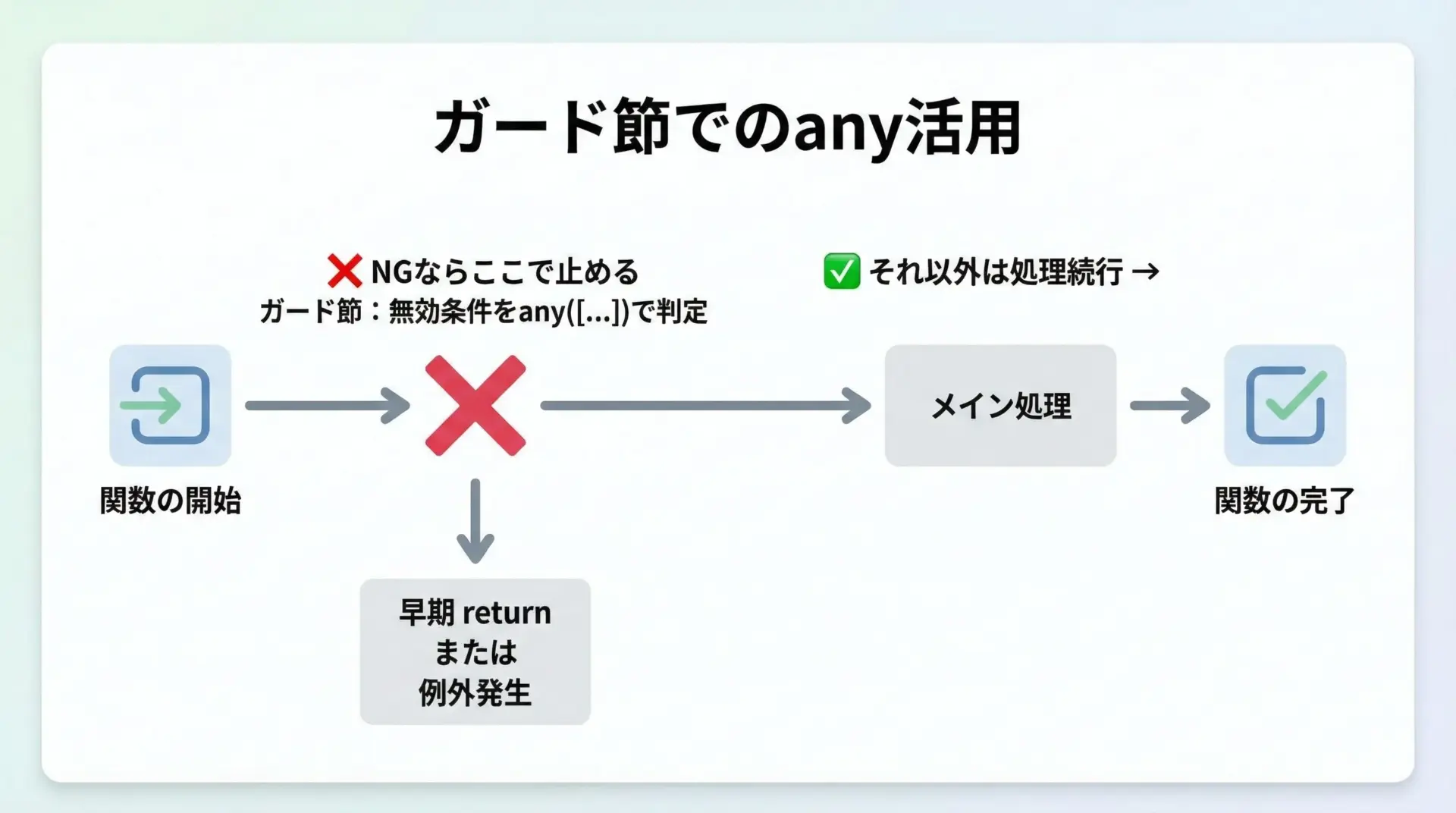 ガード節や前提条件チェックにany/allを用いると、「前提が崩れているか」「前提が満たされているか」を1行で明確に表現できます。