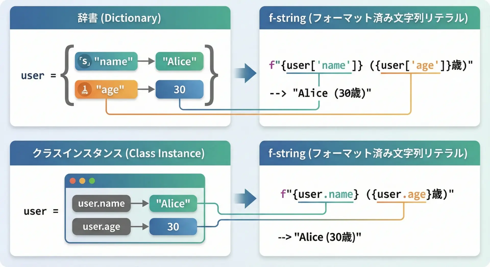 f-stringでは、辞書の要素やオブジェクトの属性も直接参照して埋め込めます。