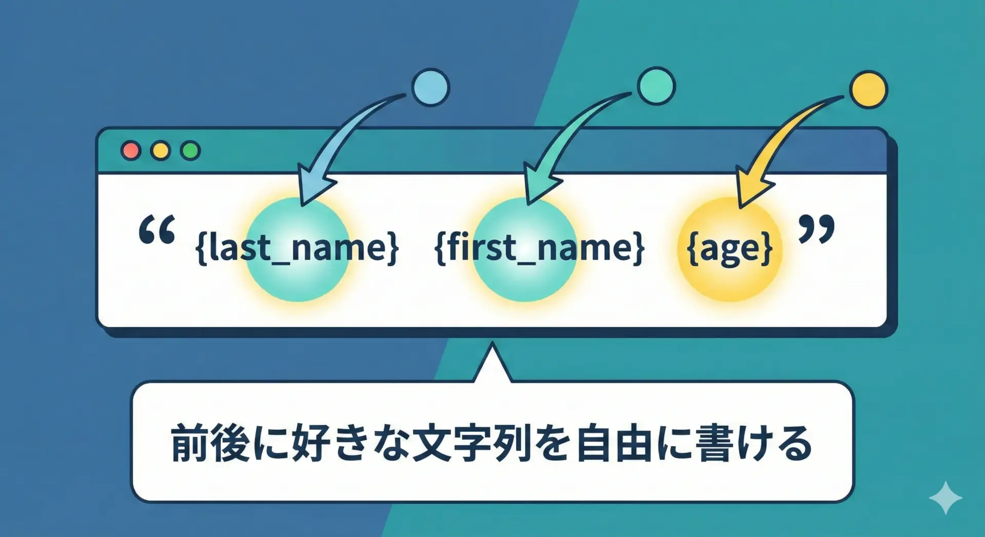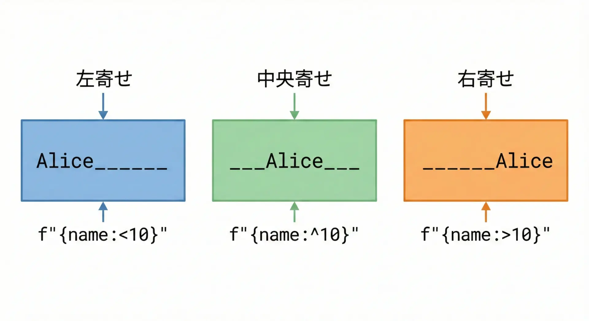このように、プレースホルダの順番やインデックスを気にせず、「その位置に入れたい値の変数名」を素直に書けるのがf-stringの大きな利点です。