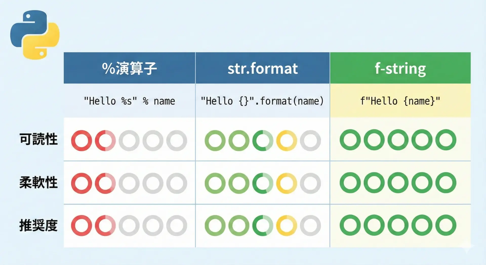 | str.format | 柔軟だが、プレースホルダと引数の対応がやや分かりにくい | 普通 | 既存コードで使用 |