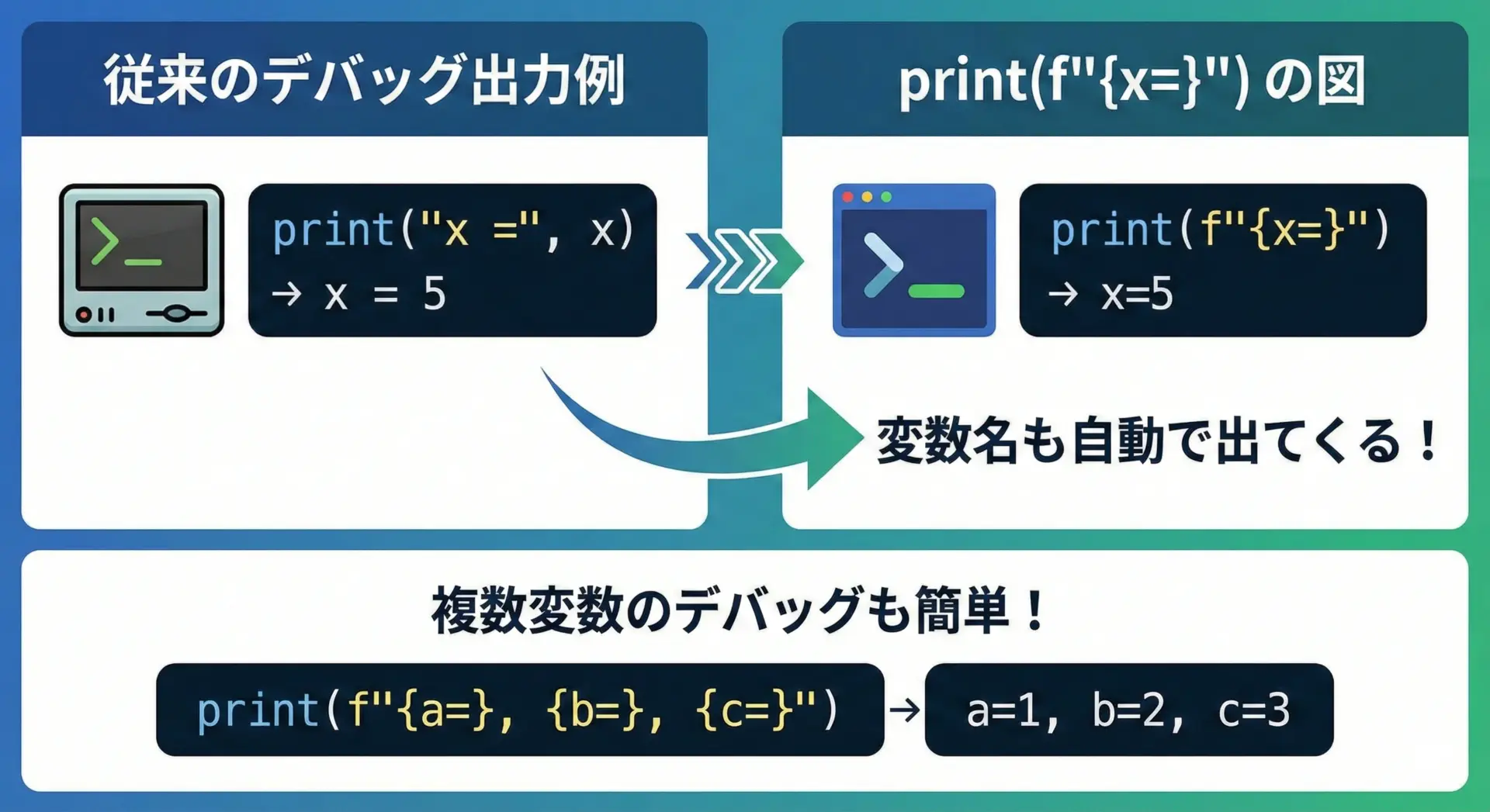 Python 3.8以降では、デバッグ向けに非常に便利なf-stringの記法が追加されています。
