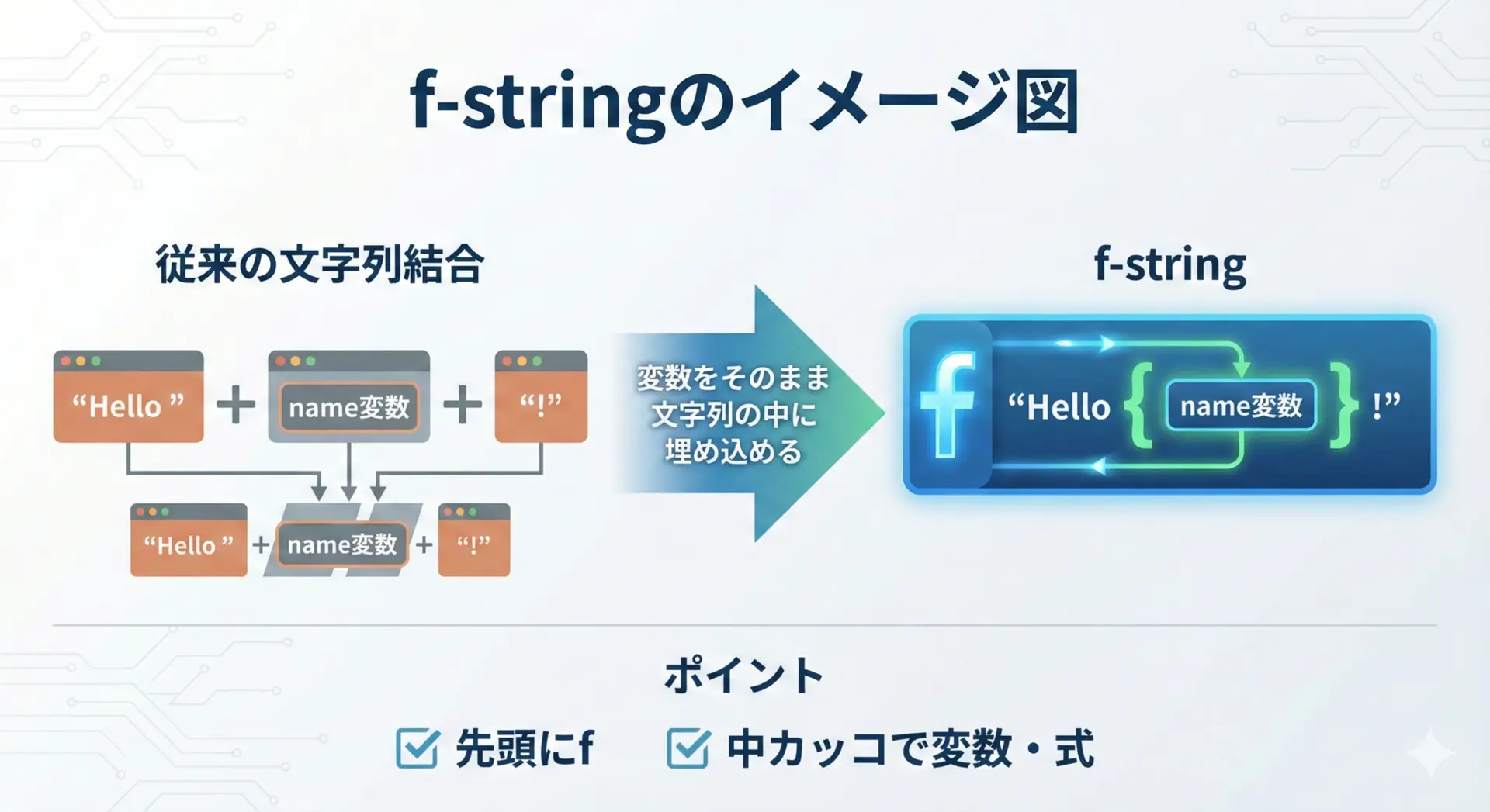 f-stringは、文字列リテラルの先頭にfまたはFを付け、波括弧{}の中に変数や式を書くだけで、その値を埋め込める機能です。