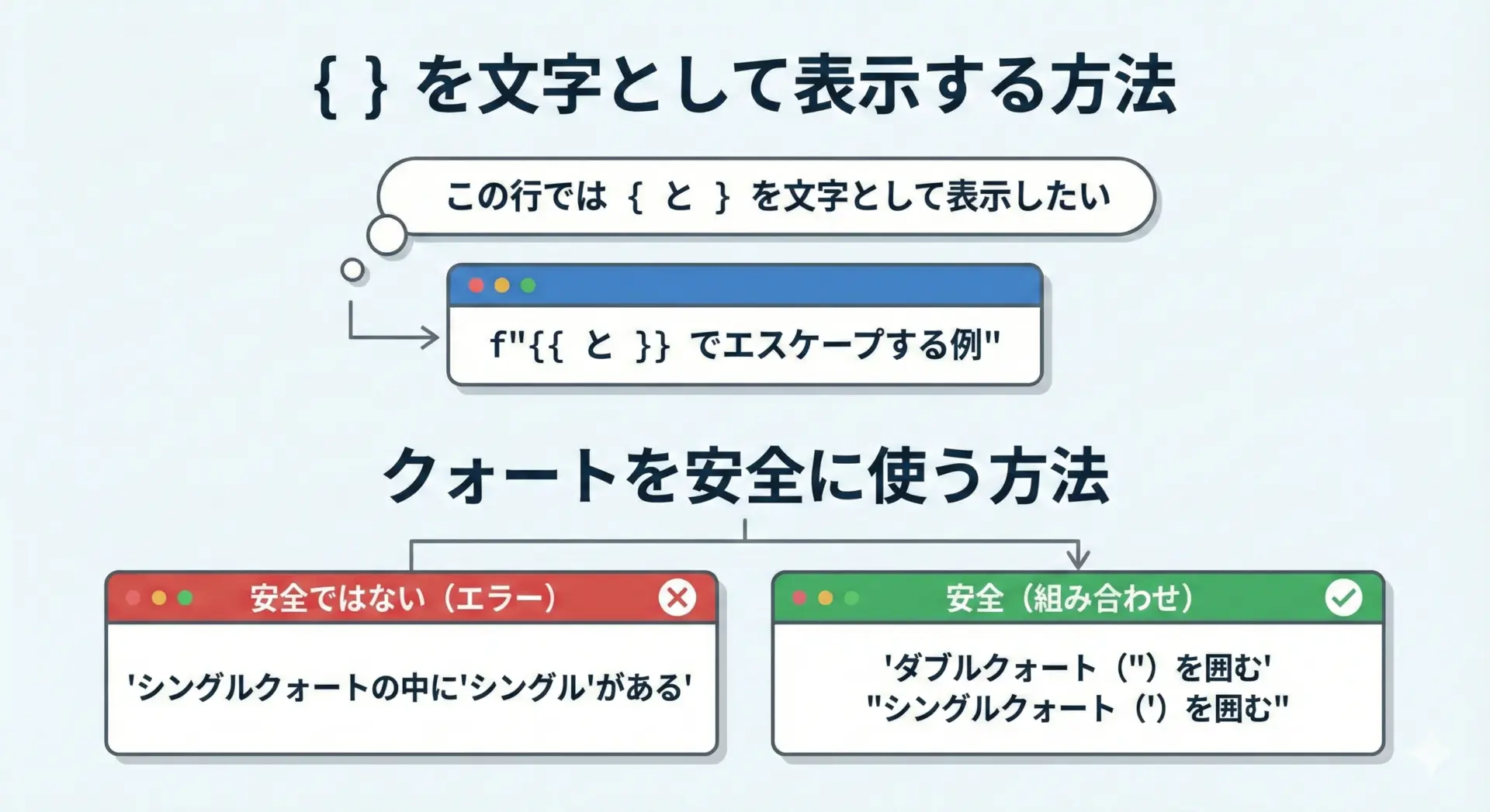 f-stringでは{}が特別な意味を持つため、文字としてそのまま波括弧を表示したいときには注意が必要です。