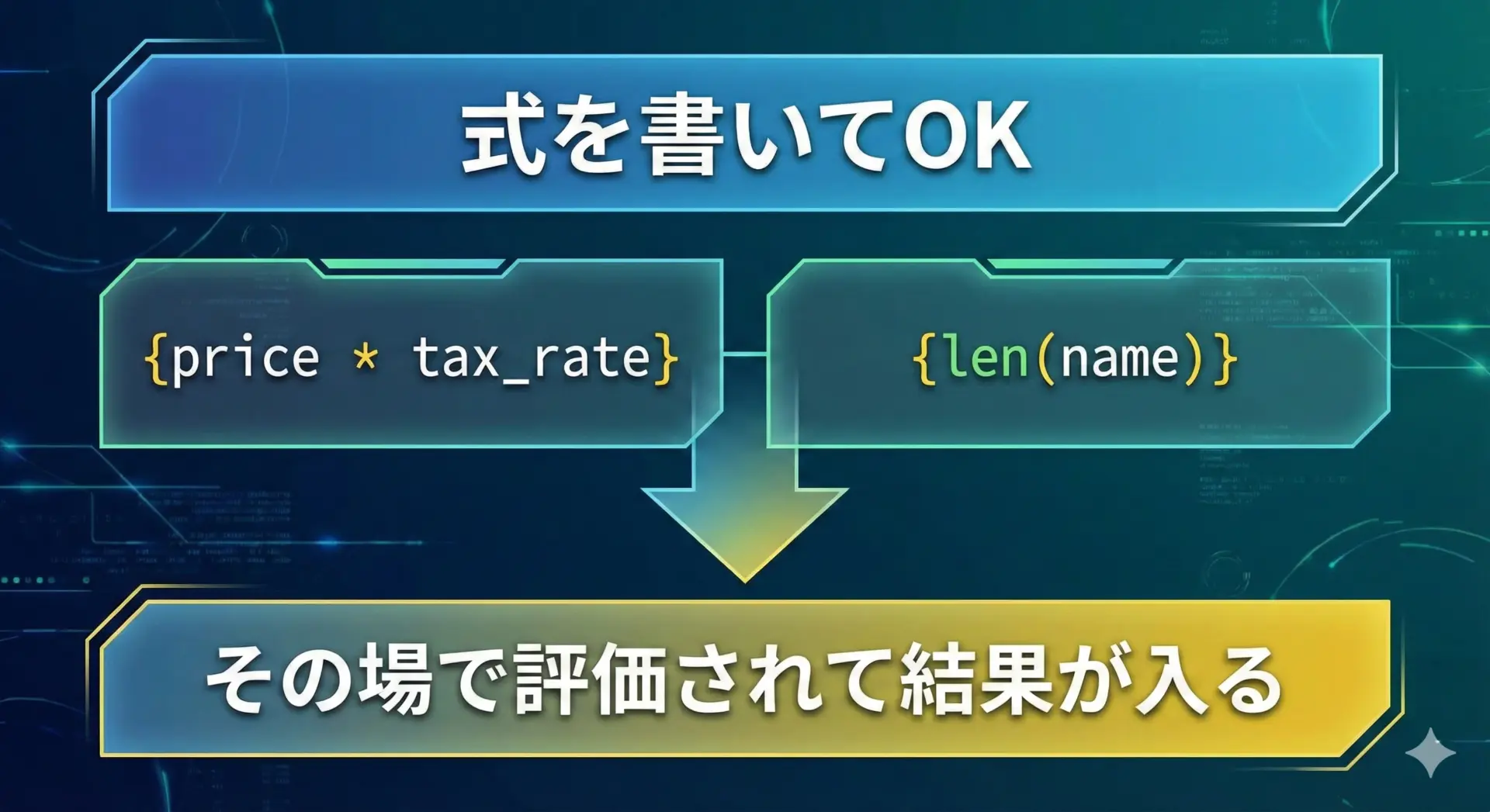 f-stringでは、中カッコの中に計算式や関数呼び出しなど「任意の式」を書けます。