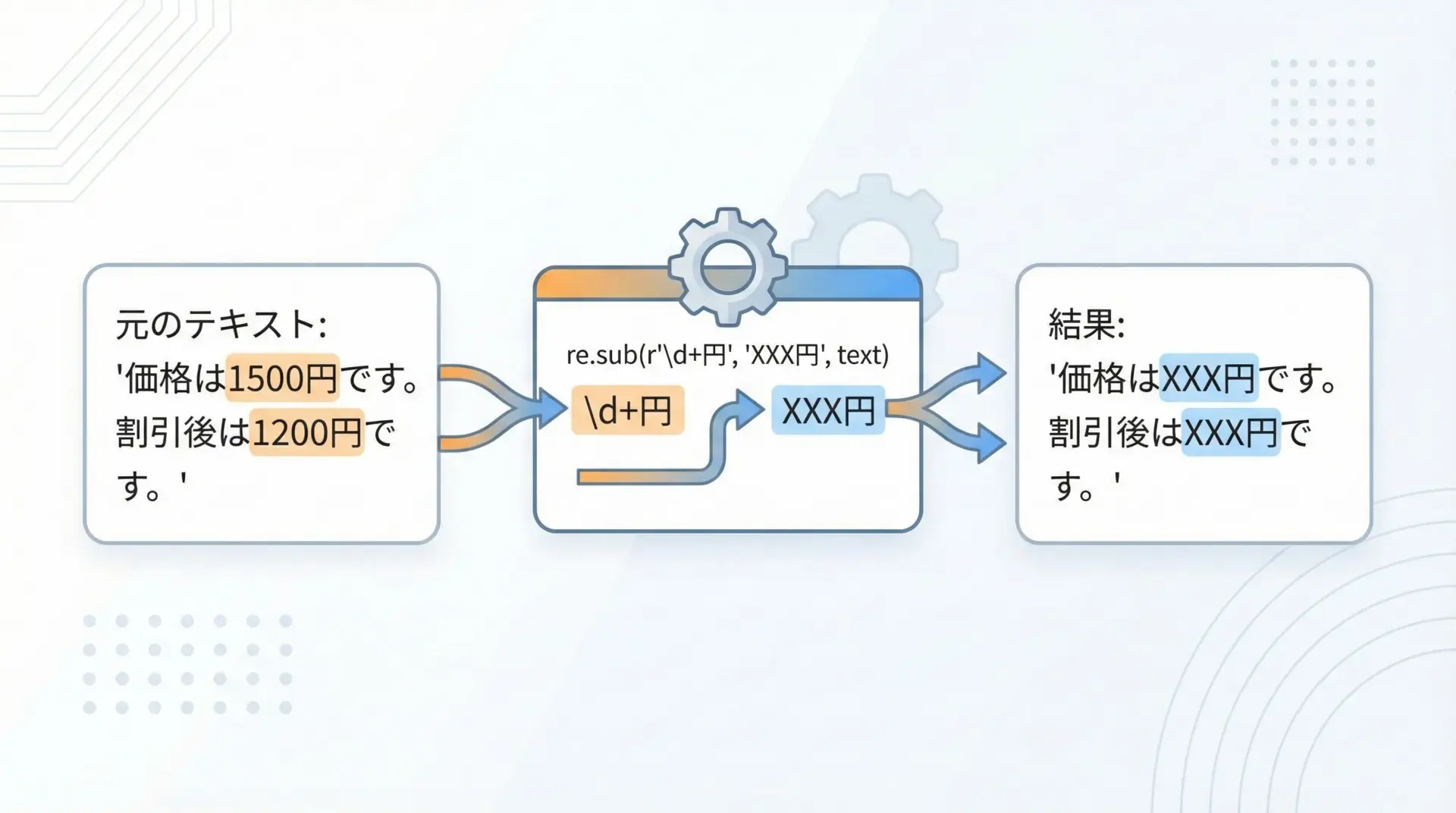 pattern: 置換対象を指定する正規表現パターンrepl: 置換後の文字列、または関数string: 元の文字列count: 置換する回数(0は無制限、デフォルト)flags: オプションフラグ(省略可)