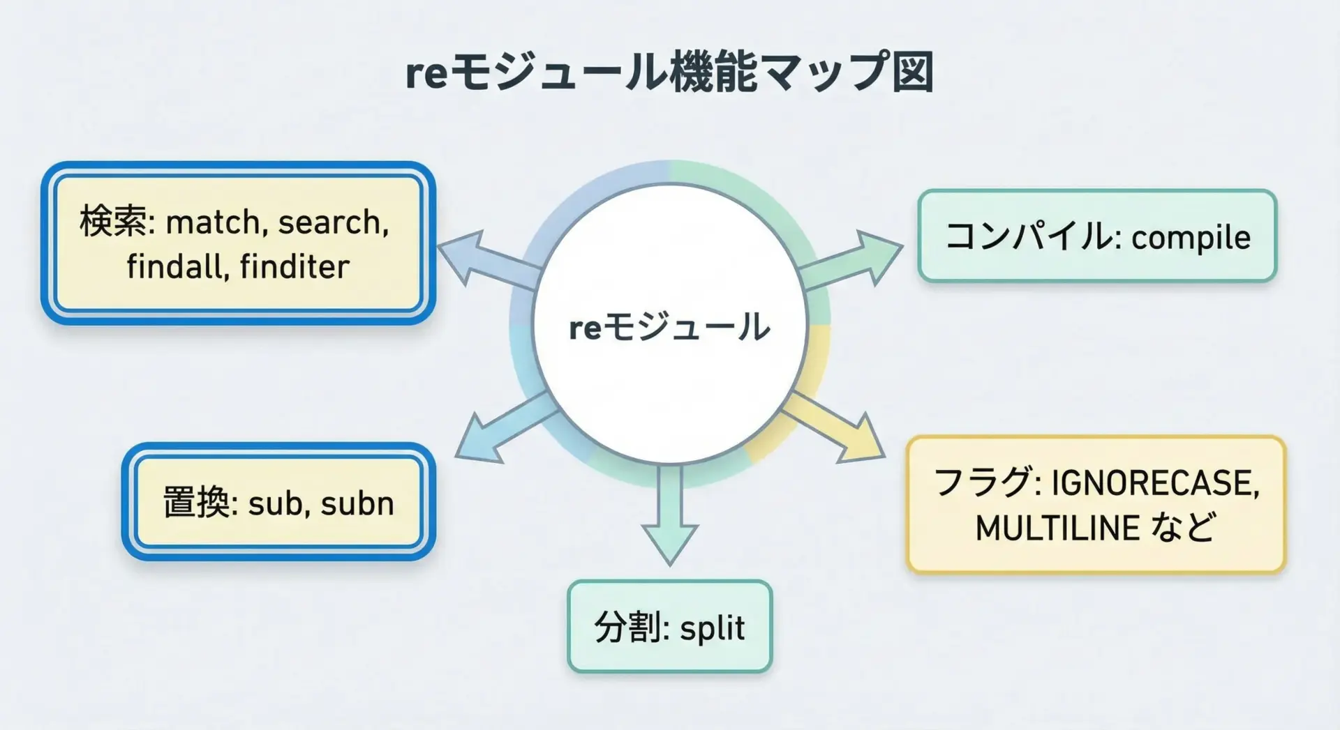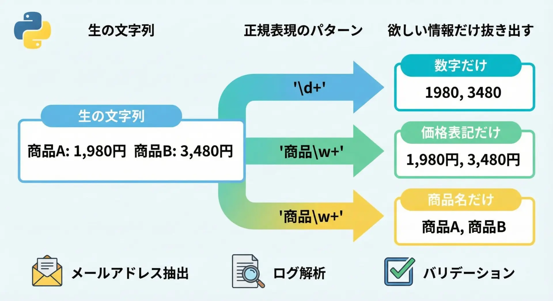 その他にもre.findall()やre.split()など便利な関数がたくさんありますが、本記事ではこの3つに焦点を当てることで、正規表現の「基本操作」をしっかり身につけていただきます。