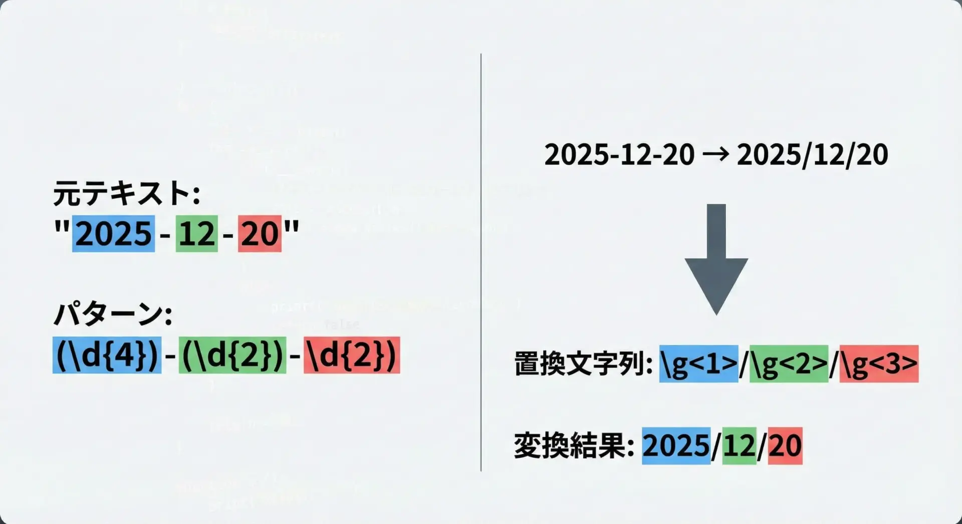 例えば、日付の表記を「YYYY-MM-DD」から「YYYY/MM/DD」に変換したい場合は次のように書けます。