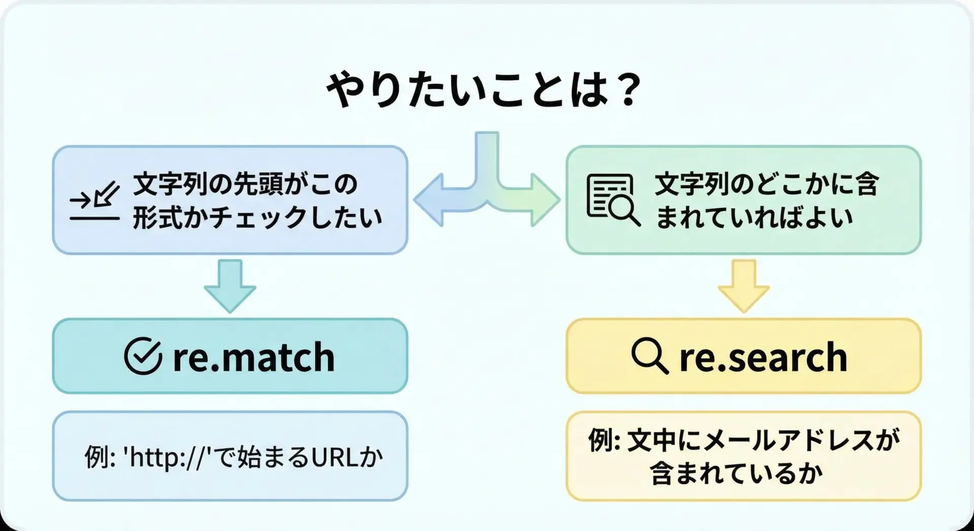 本記事では、特に使用頻度の高いre.match・re.search・re.subの3つに焦点を当てて、「先頭限定のmatch」「全文探索のsearch」「文字列置換のsub」という役割分担を押さえました。