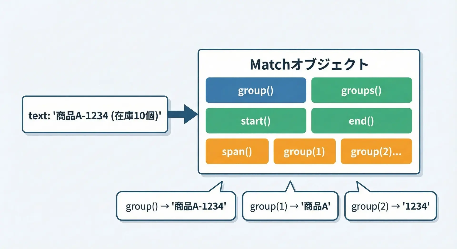 re.match()やre.search()の戻り値であるMatchオブジェクトは、どこがどのようにマッチしたのかを教えてくれる多くのメソッドを持っています。