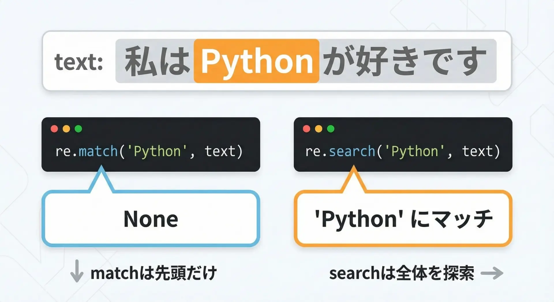 このように「文字列全体から探したいときはre.search()」「先頭からきっちり特定の形式で始まっているか確認したいときはre.match()」という使い分けを意識するとよいです。