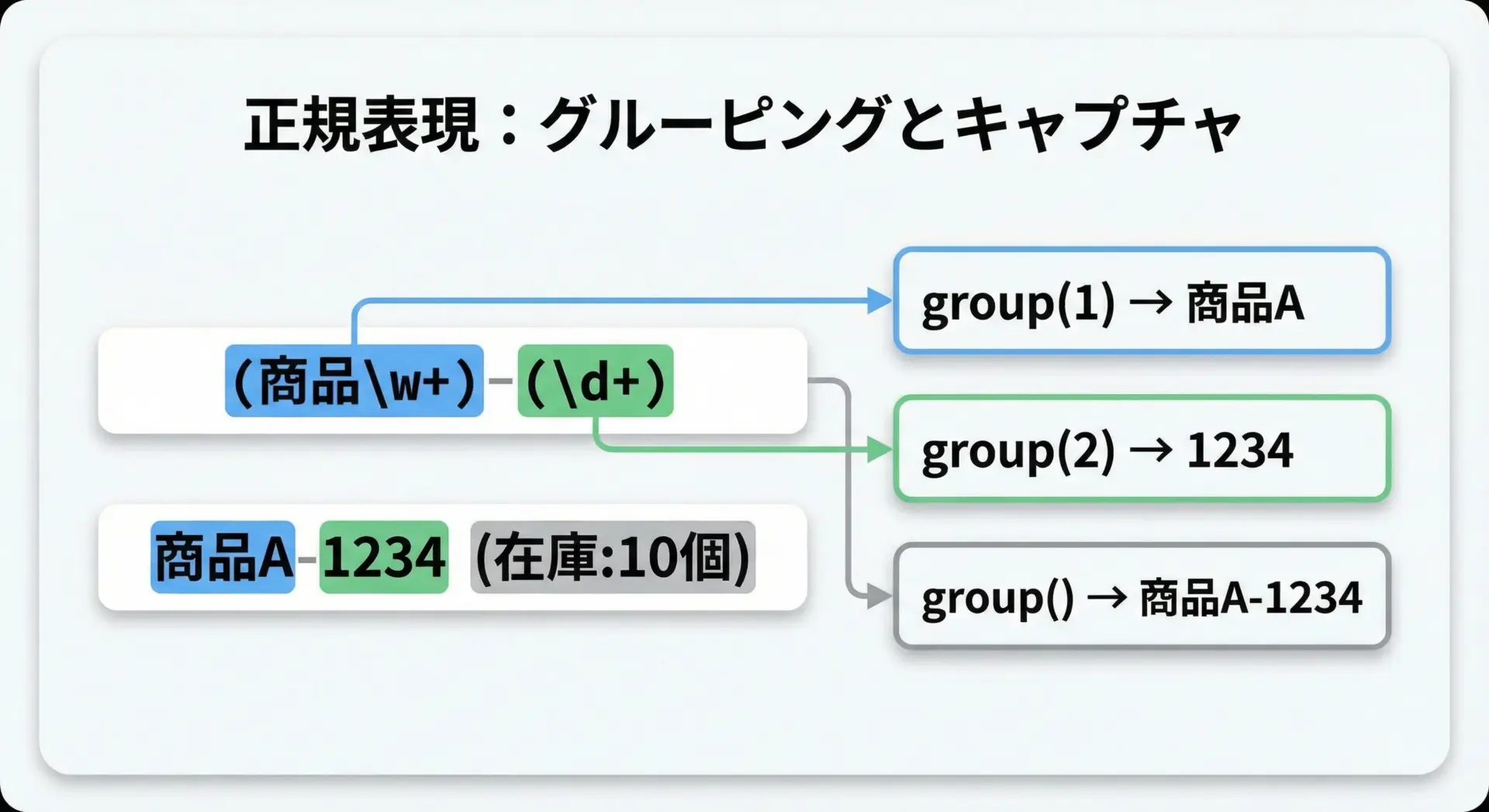 名前付きグループを使うと、group("name")のようにして読みやすくアクセスできるため、パターンが複雑になっても理解しやすくなります。