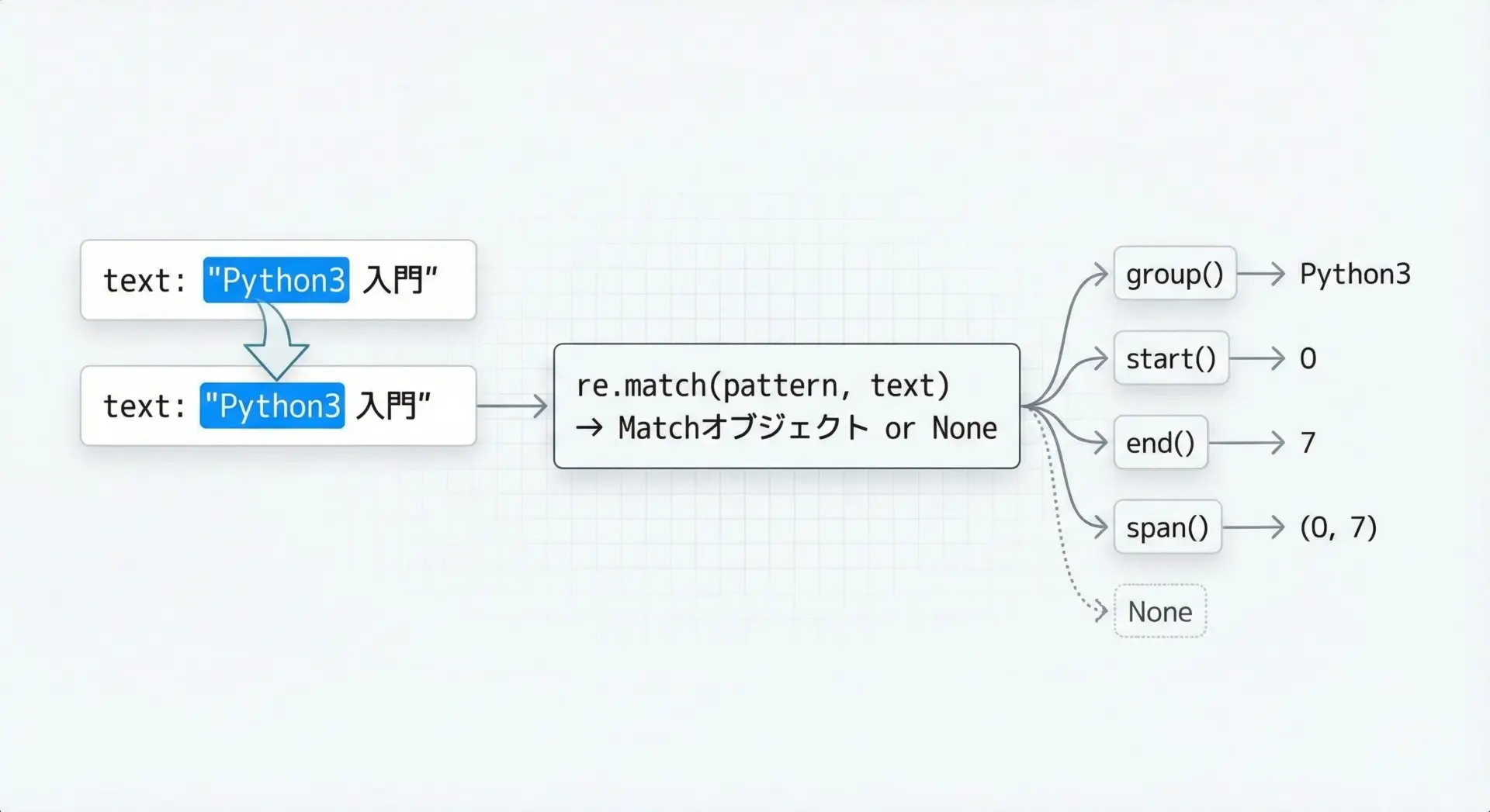 マッチに成功するとMatchオブジェクトが返され、失敗するとNoneが返されます。