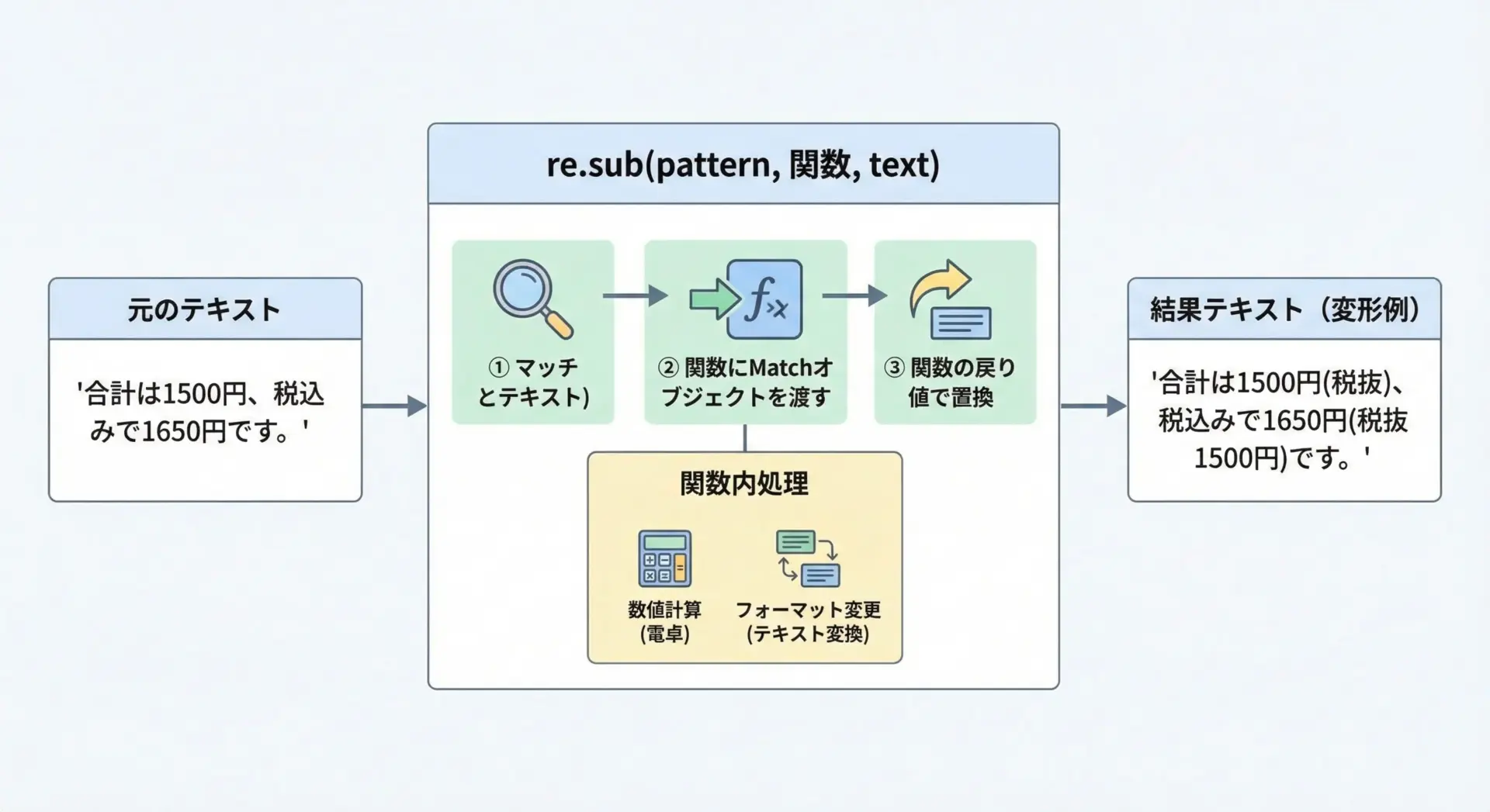 m.group(1)から金額を取得し、税抜価格を計算します。 - 「元の価格 + 税抜価格の注釈」を文字列として返し、その文字列に置き換えます。