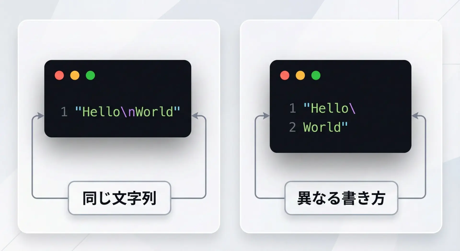 「見た目のソースコード上の改行」と「文字列に含まれる改行文字」は一致しないことがある点がポイントです。