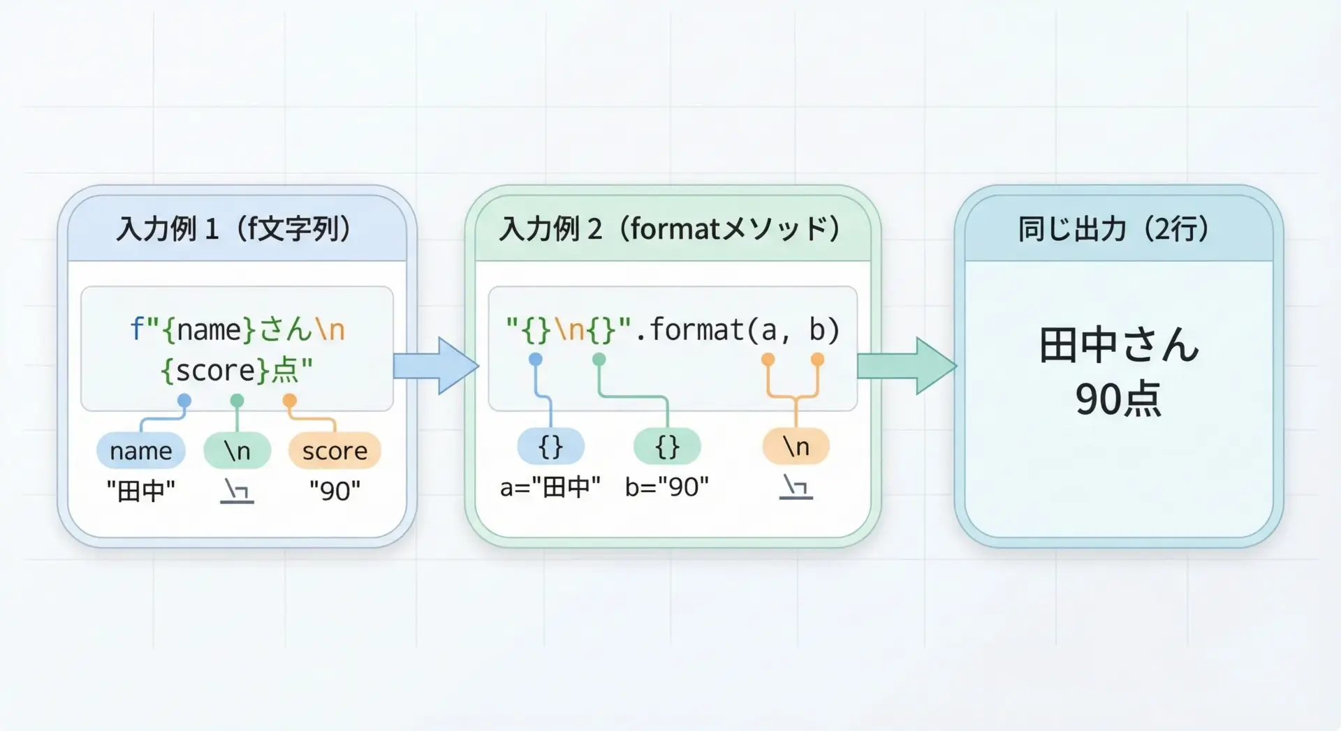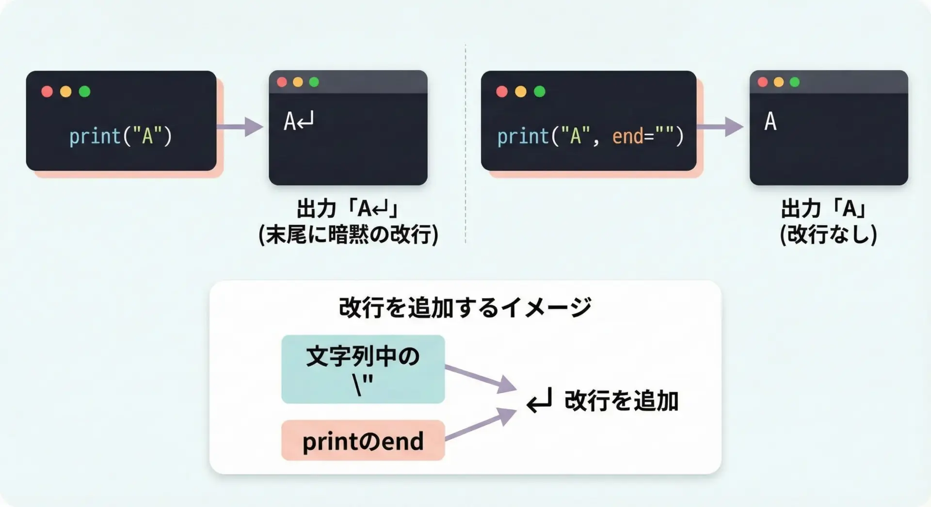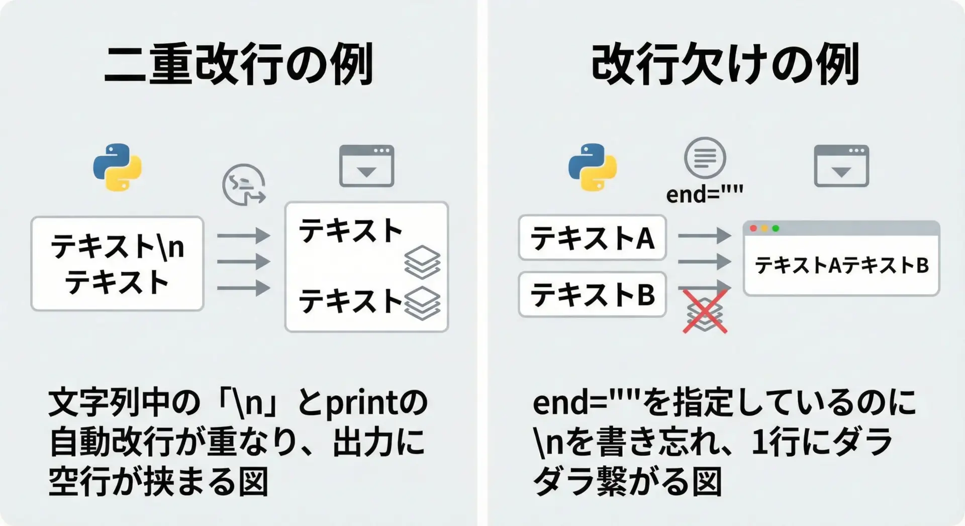 見た目の改行が多いと感じたら、「文字列中の\n」と「printのend」両方を確認する癖を付けると、トラブルを早く発見できます。