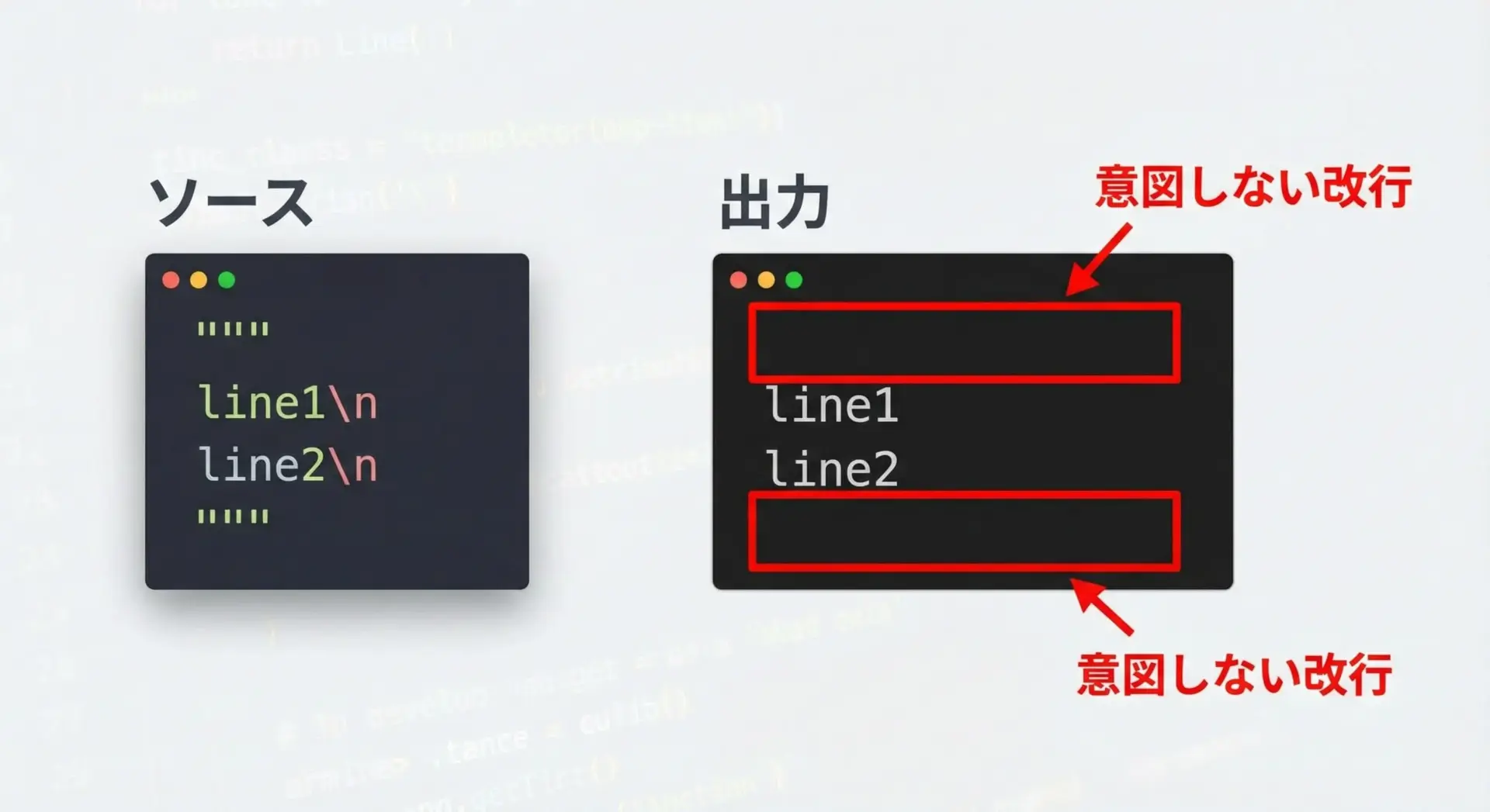特に三重クォートでは、意図せず先頭や末尾に余計な改行が入ることがあるため、後半で具体的な対処法も紹介します。