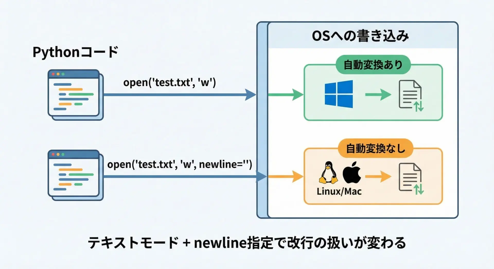 Pythonは基本的に「どのOSでも同じコードで扱えるようにする」ため、標準ライブラリ側で改行コードの差を吸収する仕組みを持っています。