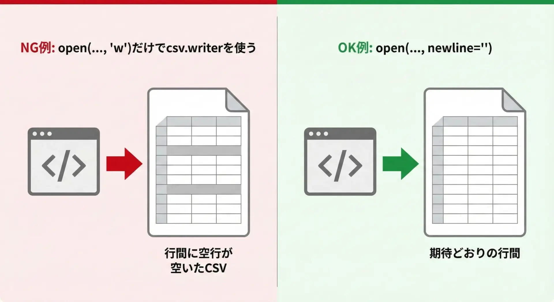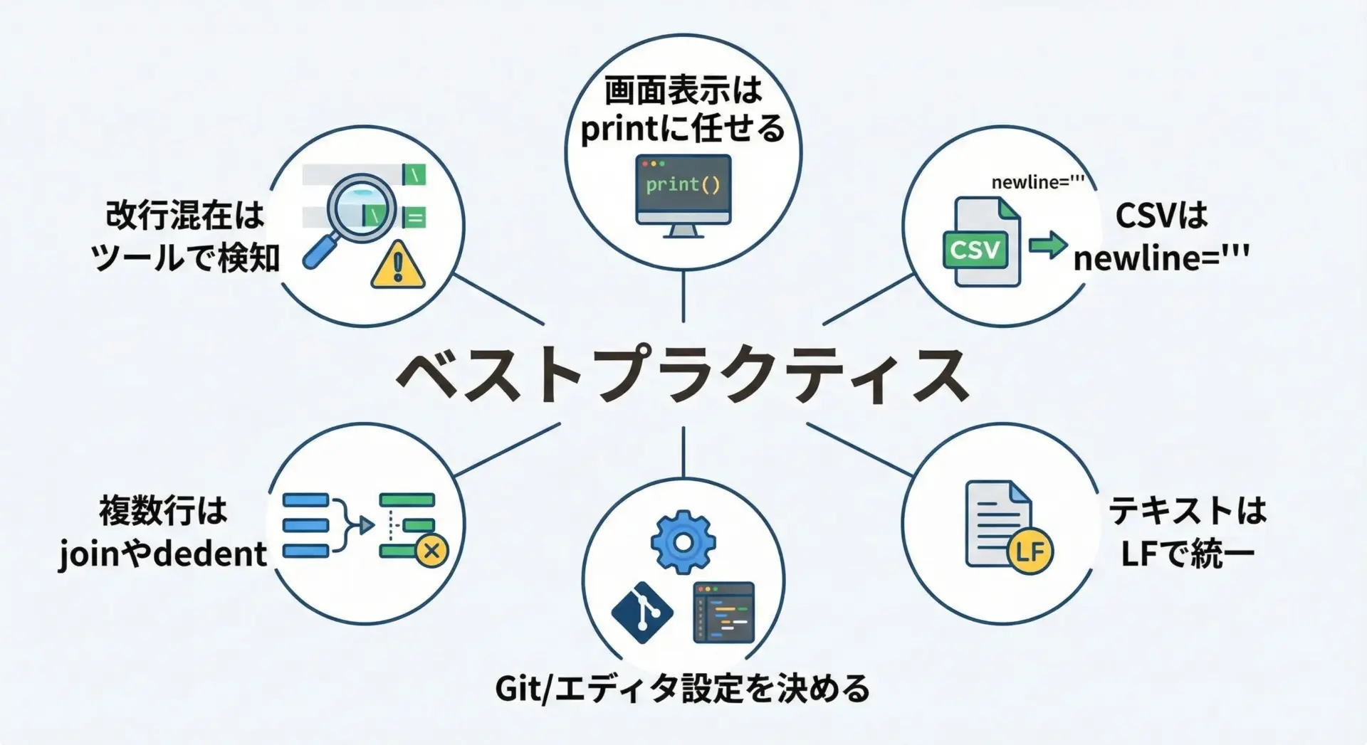 特にCSVのnewline=""指定や、Git・エディタでLF統一を行うだけでも、多くのトラブルは未然に防げます。