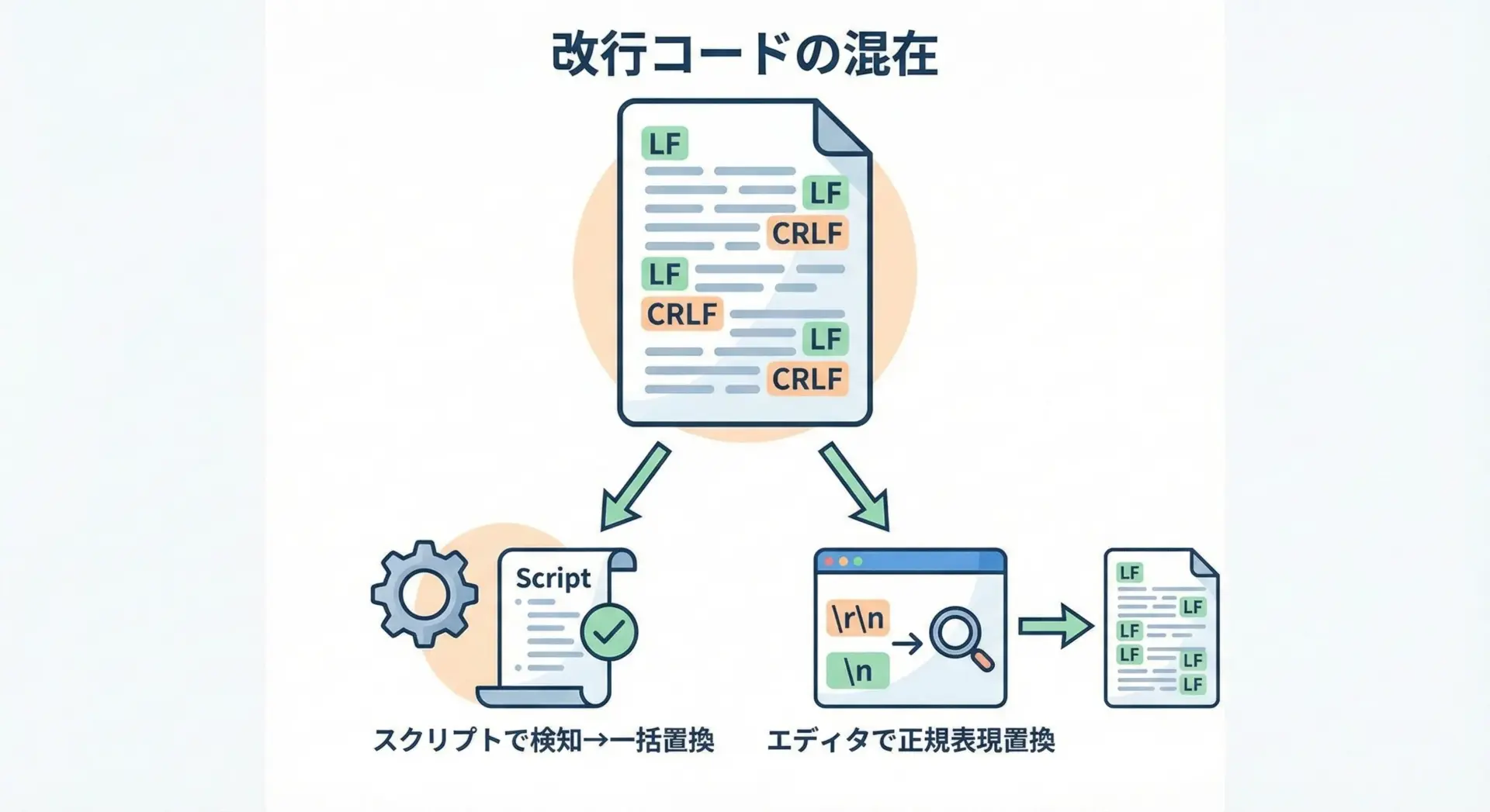 他人から受け取ったファイルや、古い環境からコピーされたデータでは、改行コードが混在していることがあります。