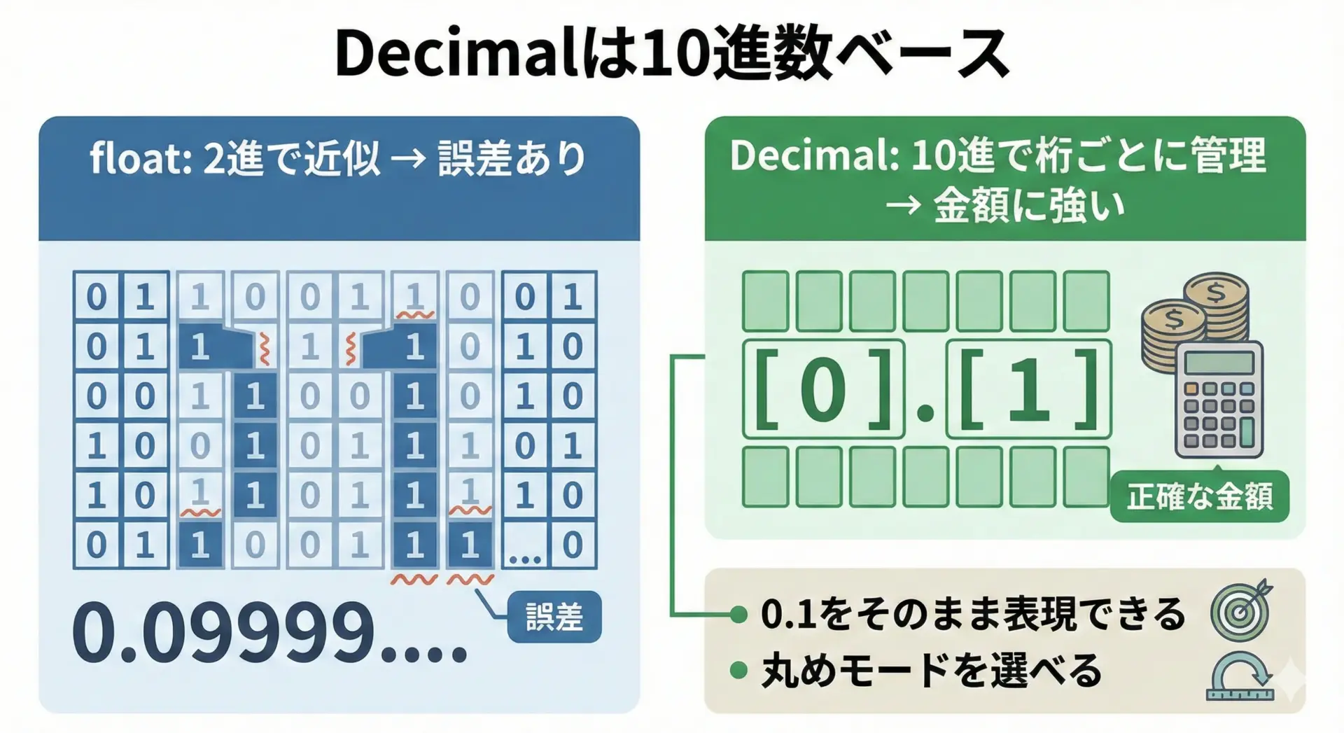 このため、金額や点数など「有限桁でピッタリ表現したい数字」はDecimalで扱うことが重要です。