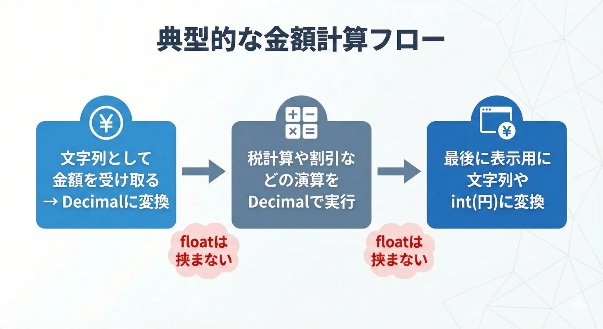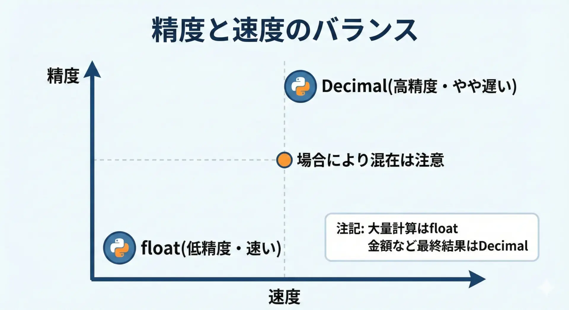 | Decimal | Decimal(“0.1”)など | 金額、税計算、為替、精密演算 | 10進数ベースで高精度、速度はfloatより遅い |