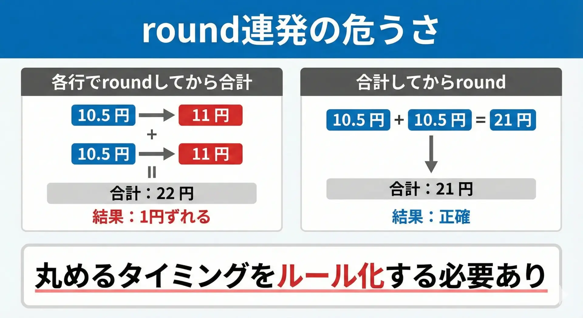 - 1件ごとの計算では小数点以下の誤差が見えないが、大量件数の合計で1円以上のズレになる。