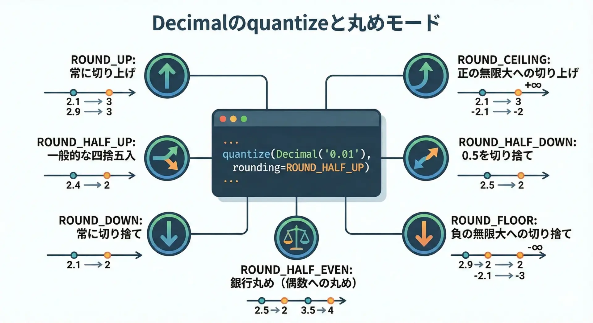 | ROUND_HALF_EVEN | 偶数への丸め(Pythonのroundと同じ) | 統計・会計の一部 |