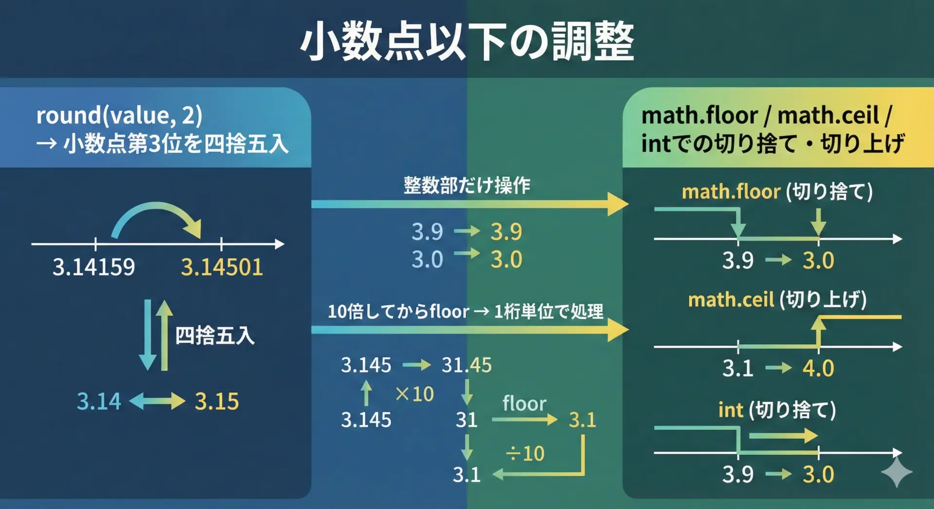 業務要件に応じてどの丸めモードを使うかを明示し、コード上でも定数で指定することで、「なんとなくroundした結果」が変わってしまうリスクを減らせます。
