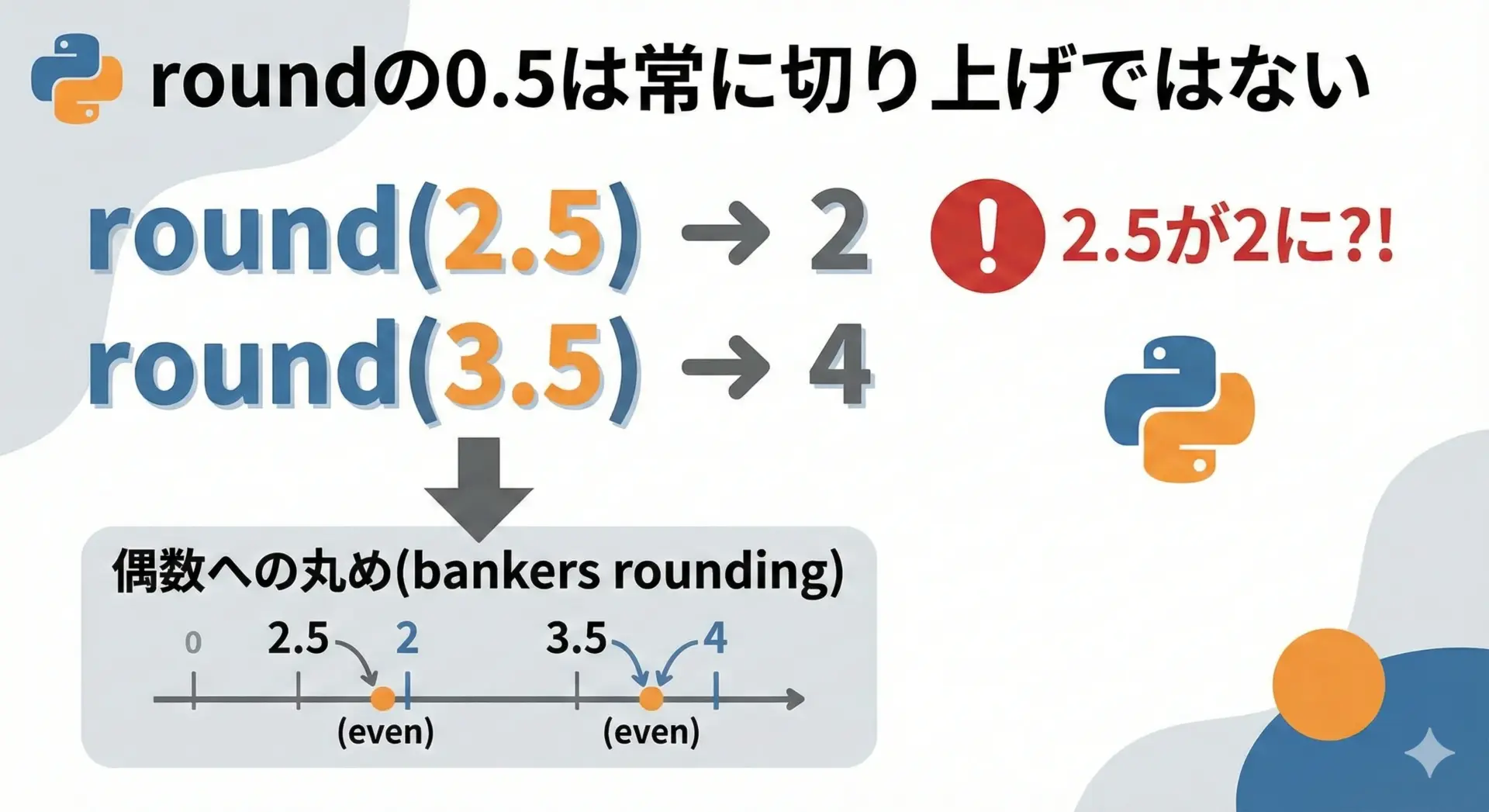 Pythonのroundは、「0.5は常に切り上げる」わけではない点に注意が必要です。