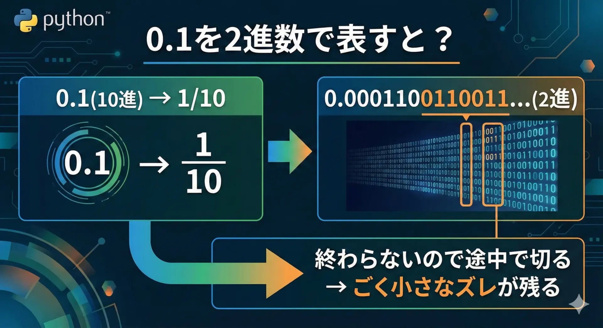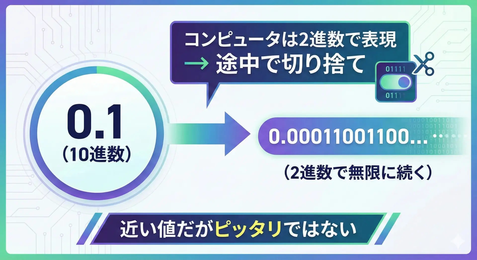 1/10(=0.1)は、2進数では0.0001100110011...と「0011」が繰り返される無限小数になります。 - しかし、コンピュータのメモリには有限のビット(例えば64ビット)しかないため、どこかで切り捨てる必要があります。