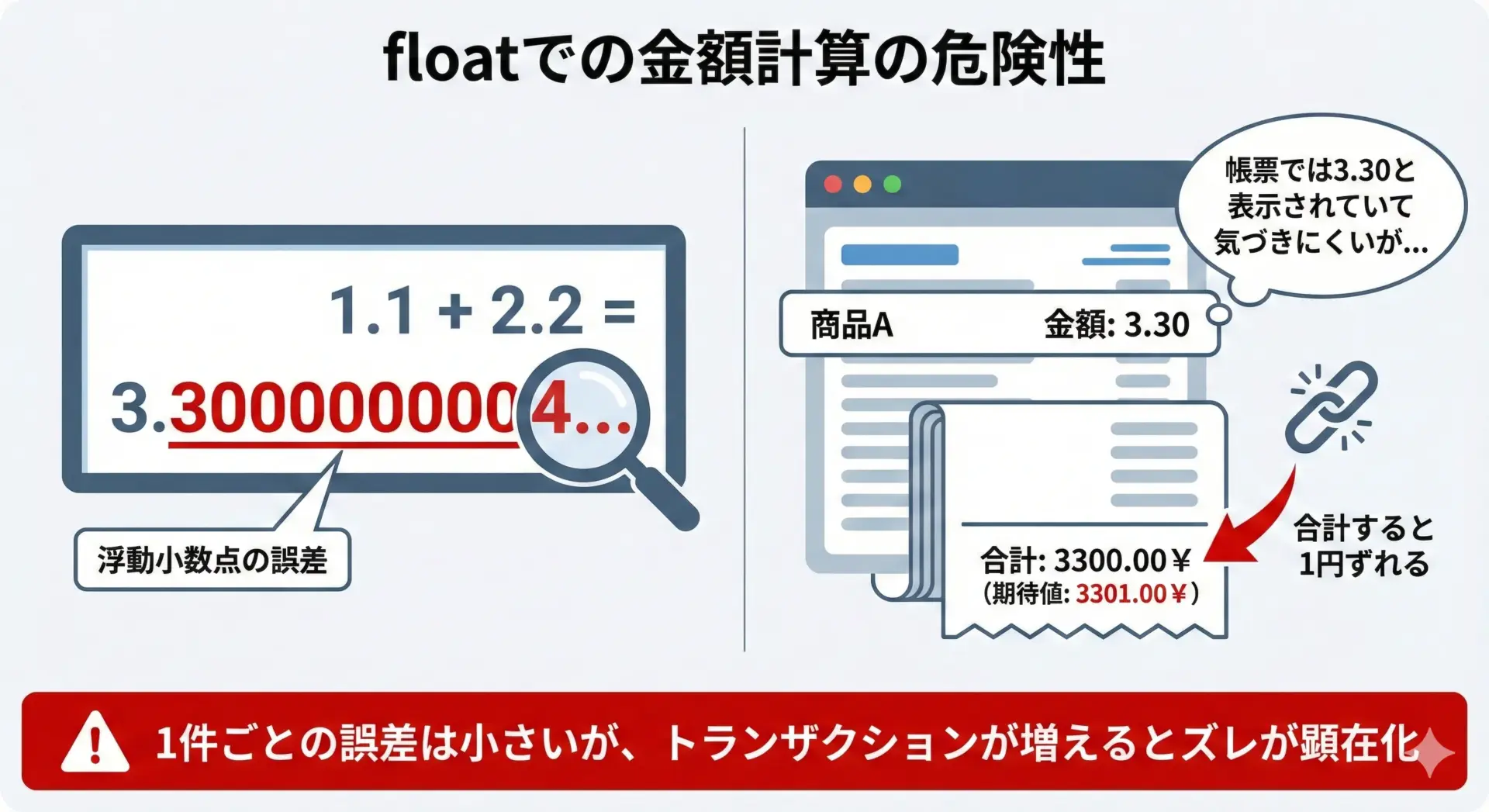 金額計算のように、「少数第2位まで」「1円単位で厳密に合うこと」が要求される場面でfloatをそのまま使うと、次のようなリスクがあります。