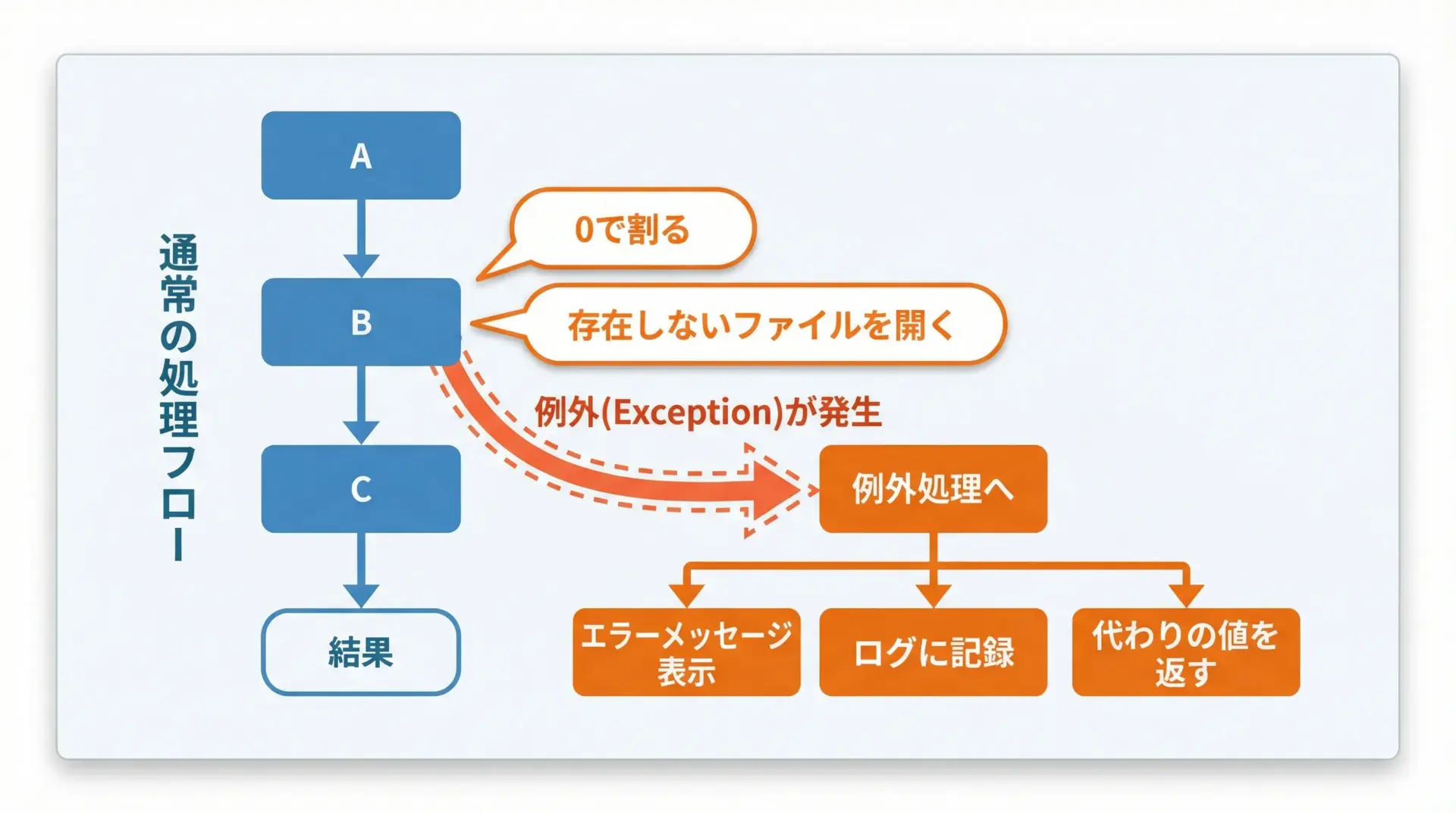 例えばWebアプリケーションや自動バッチ処理では、ちょっとした例外で全体が止まると大きな問題になります。