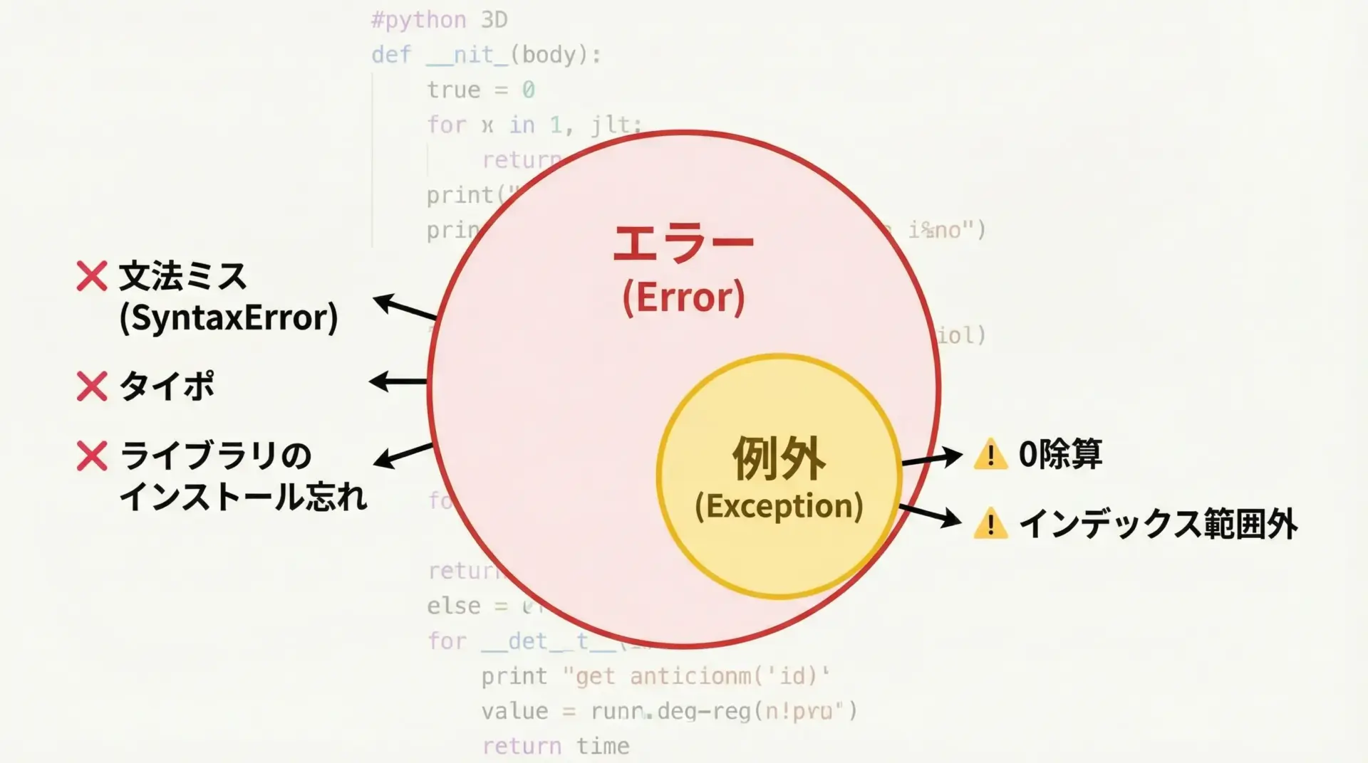 Pythonでプログラムを書いていると、「エラー」という言葉と「例外(Exception)」という言葉がよく登場します。