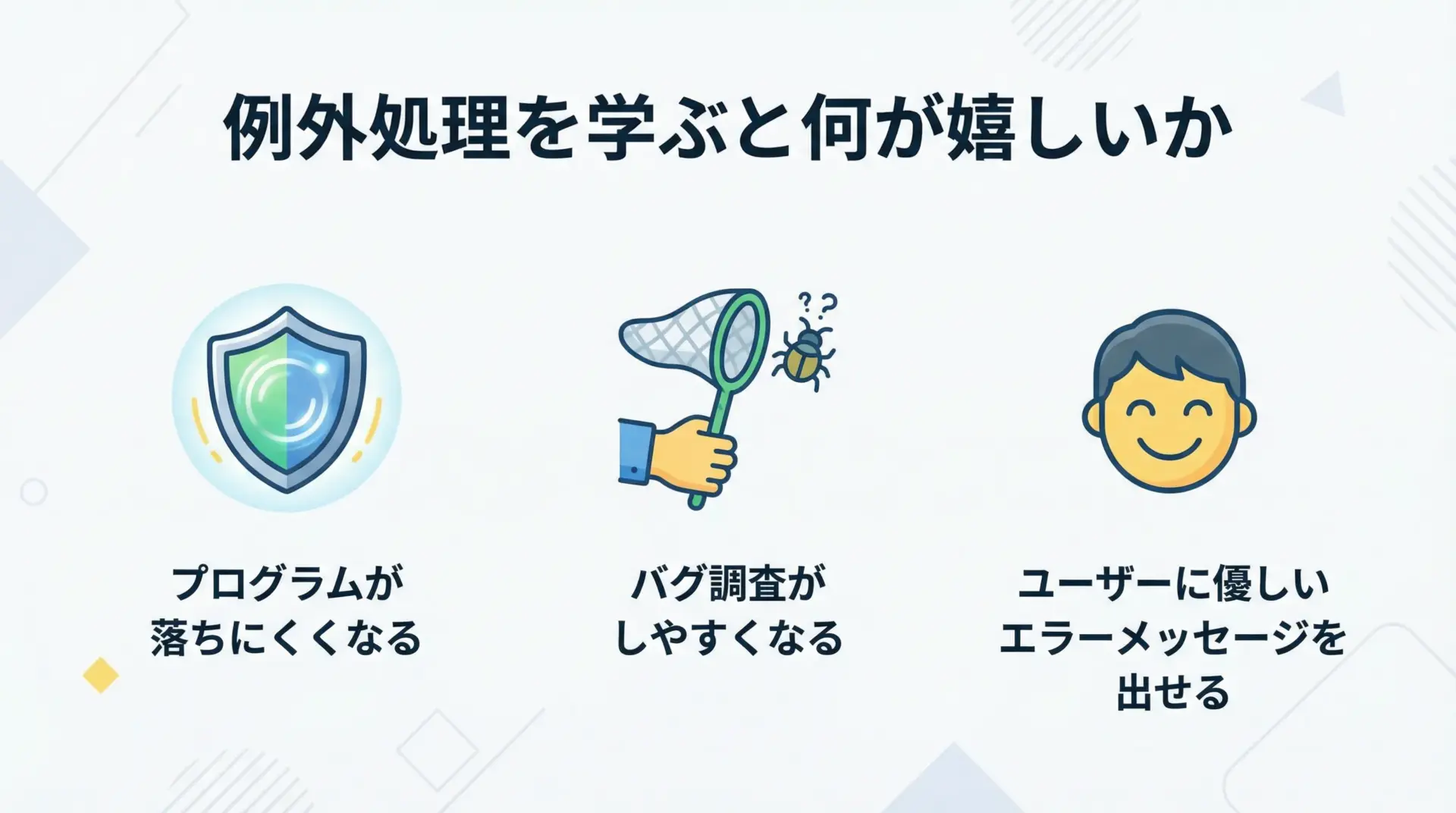 例外処理を学ぶことには、初心者のうちから大きなメリットがあります。