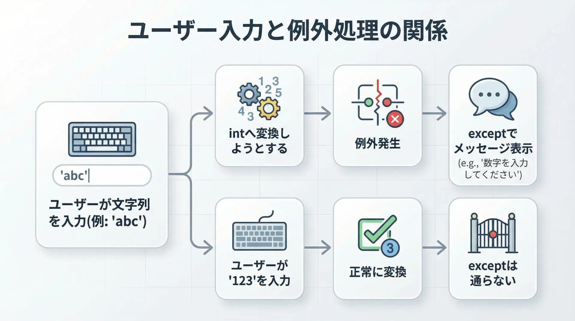 ユーザーが数字以外の文字を入力した場合、int()への変換で例外が発生します。