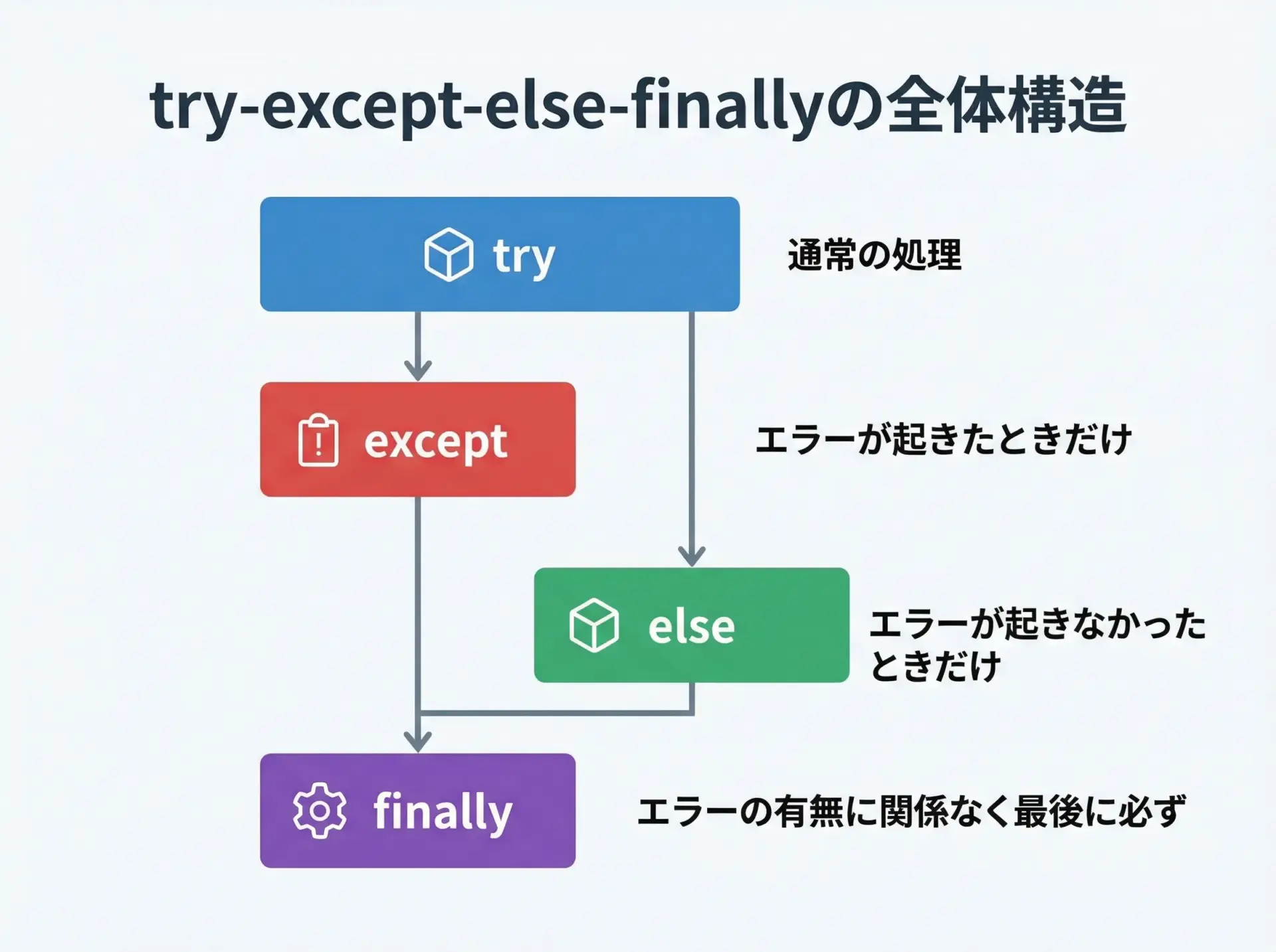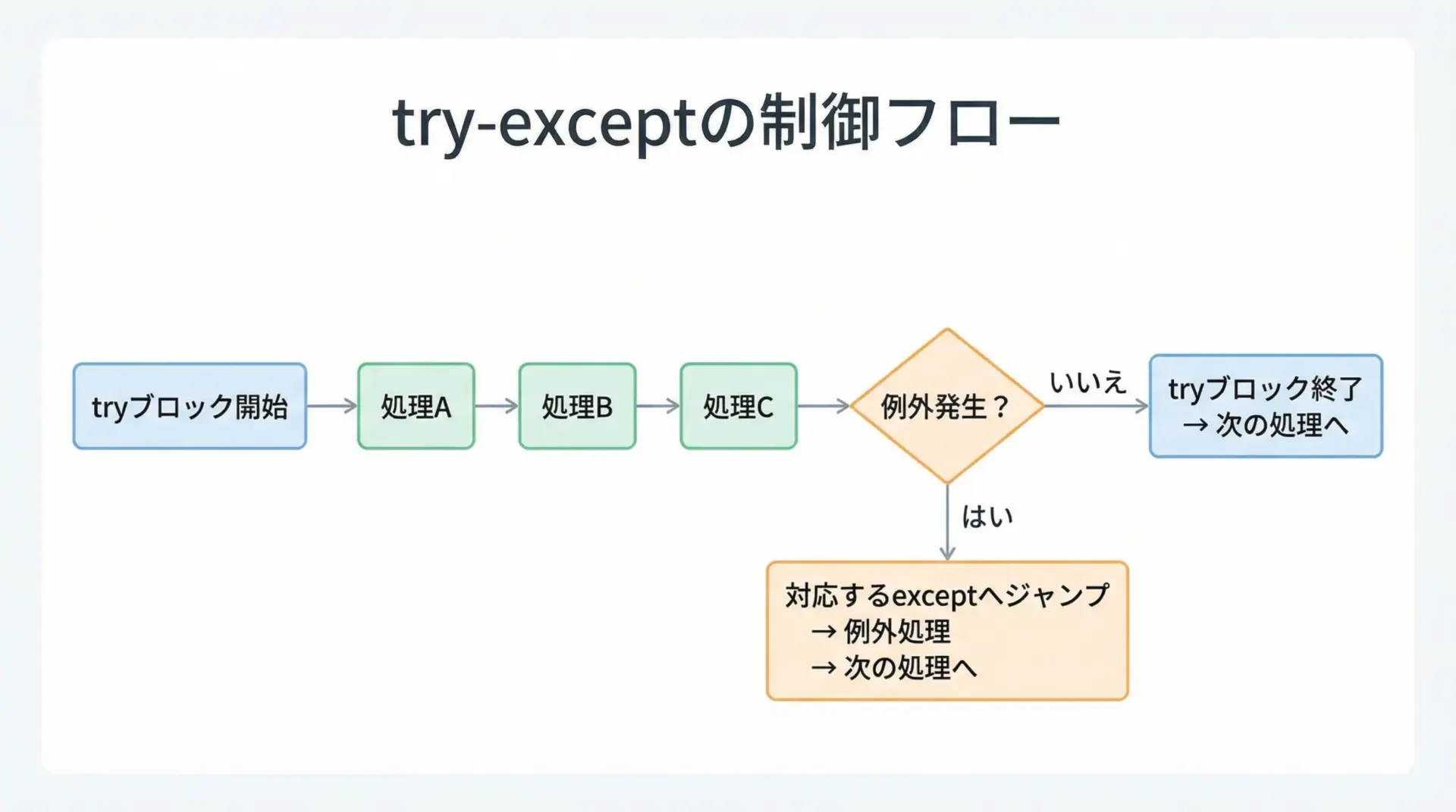 本記事では、Python初心者の方を対象に、try-exceptを中心とした例外処理の基本を、図解とサンプルコード付きで丁寧に解説していきます。