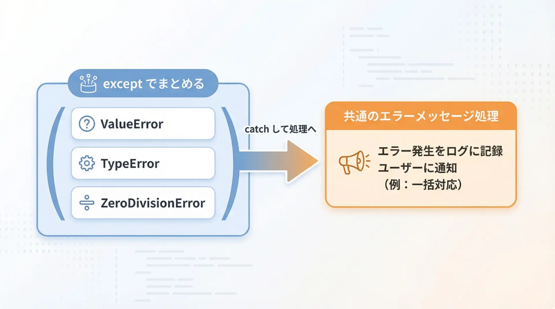 例外の種類が複数あるものの、どの例外でも同じ処理でよい場合は、タプルでまとめて1つのexceptに書くことができます。