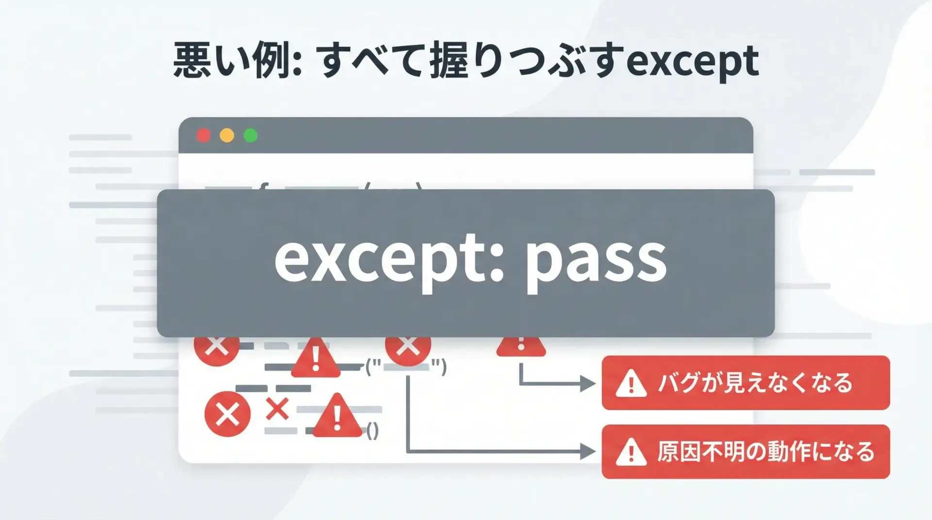 また、捕まえた例外の種類が分からないため、誤った状態で処理が続いてしまう危険もあります。