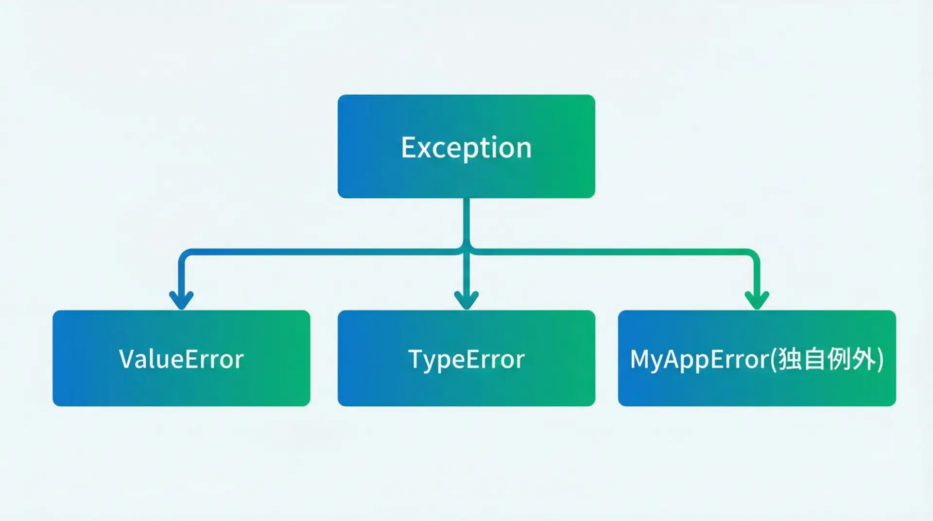 これらはすべて「例外オブジェクト」として扱われ、後述するtry-except構文で捕まえて処理を分岐させることができます。