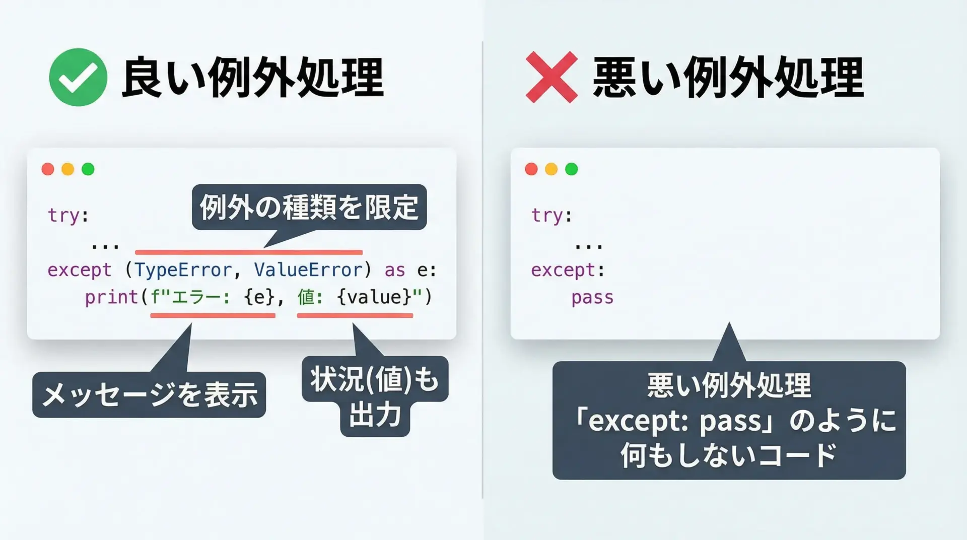 ValueErrorやTypeErrorといった代表的な例外の違い、複数exceptやelse・finallyの活用、独自例外クラスの基本、そして「乱用NGな書き方」まで押さえておけば、実務レベルのコードでも安心してエラー対策ができるようになります。