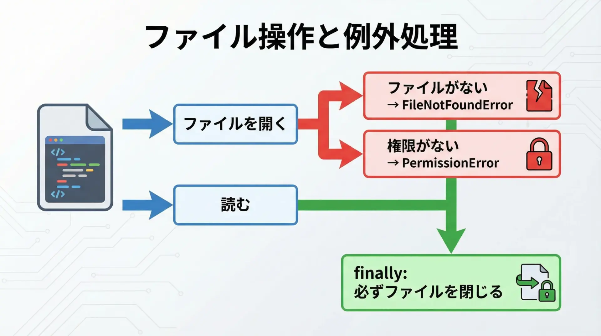 ファイルの読み書きは、例外処理が特に重要になる代表的な場面です。