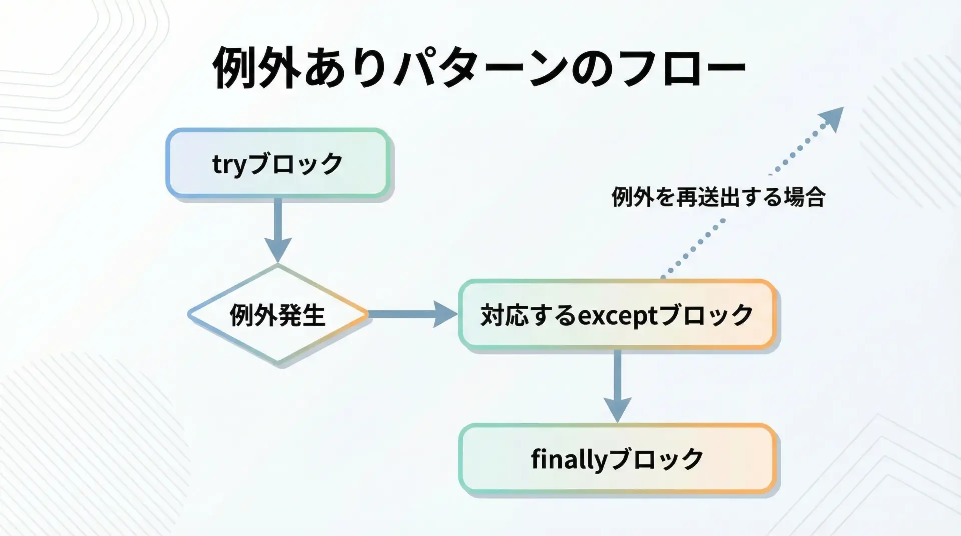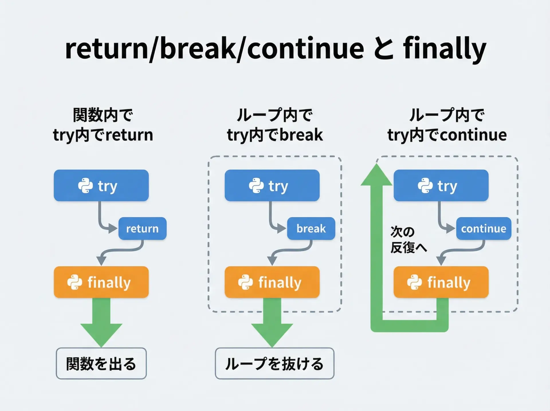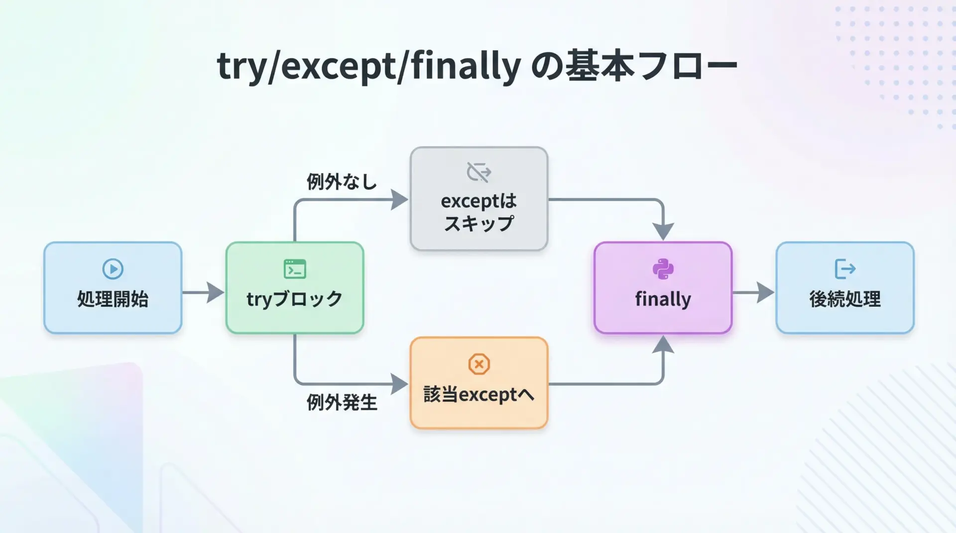 本記事では、まずtry/except/finallyの基本挙動を丁寧に整理し、そのうえで「なぜほぼ必ずなのか」「どんな場合に実行されないのか」を、サンプルコードや図解を交えながら詳しく解説します。