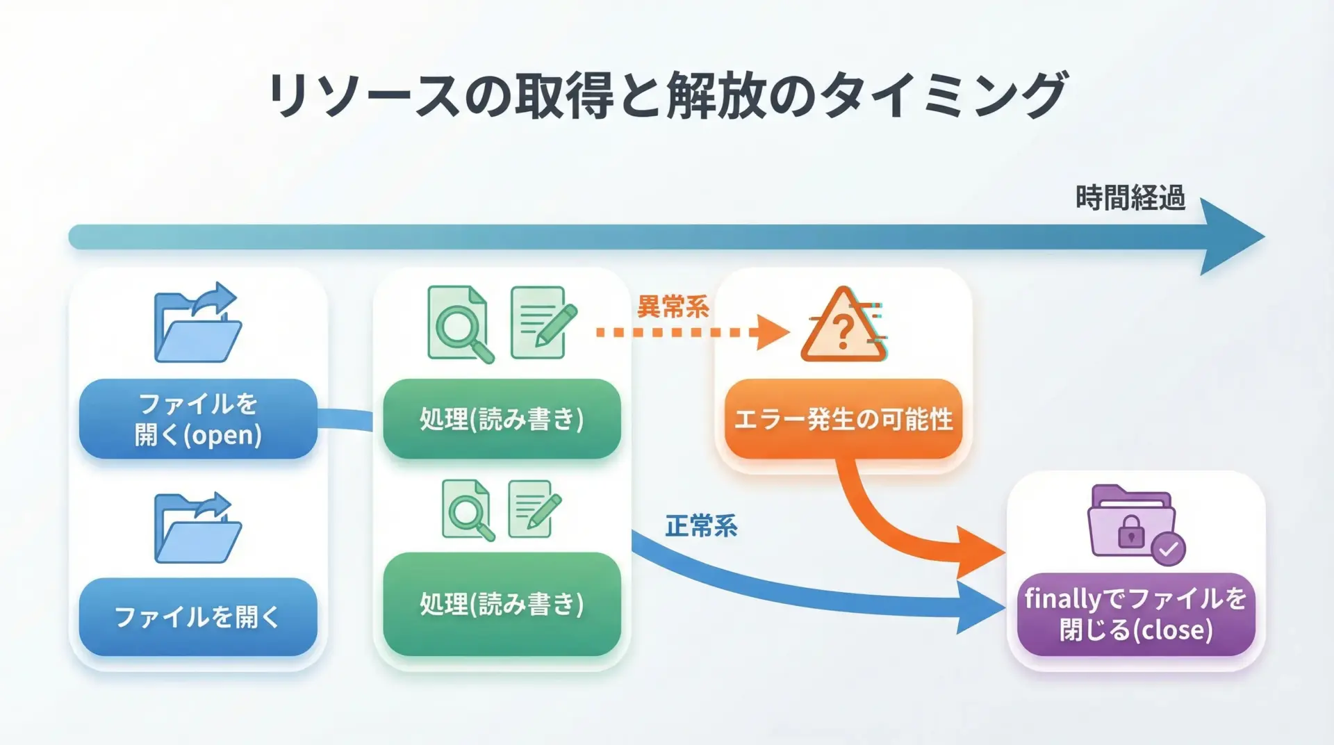 このようにしておけば、読み取り処理の途中で例外が発生しても必ずclose()が呼ばれるため、ファイルが開きっぱなしになることを防げます。