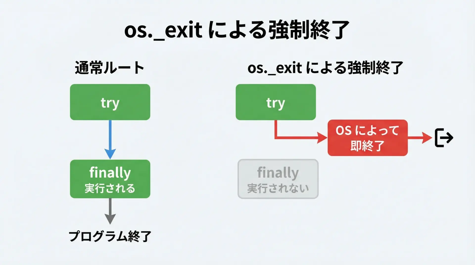 これは言い換えると、「finally は Python の制御フローの中ではほぼ必ず実行されるが、OS やハードウェアレベルの障害には無力」ということです。