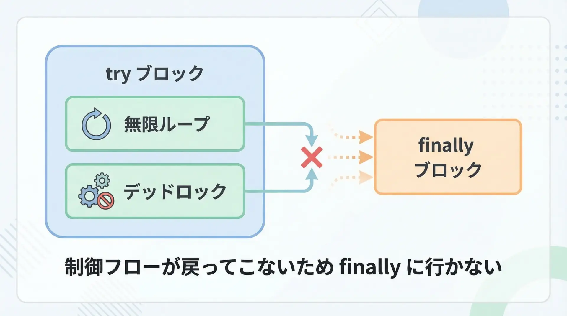 無限ループ・デッドロックでfinallyまで到達しないケース