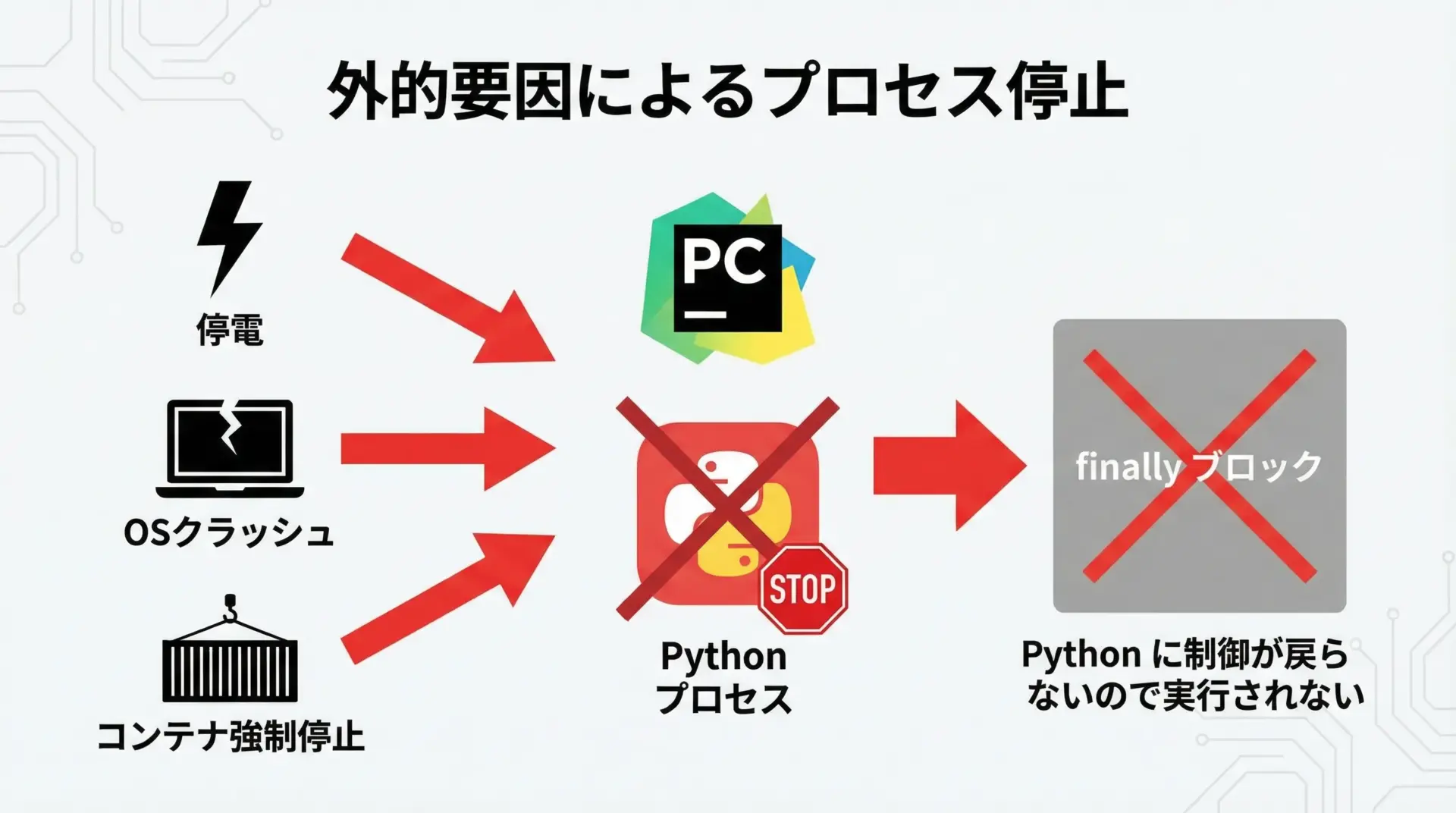 最後に、物理的・外的な要因でプロセスが止まるケースも整理しておきます。