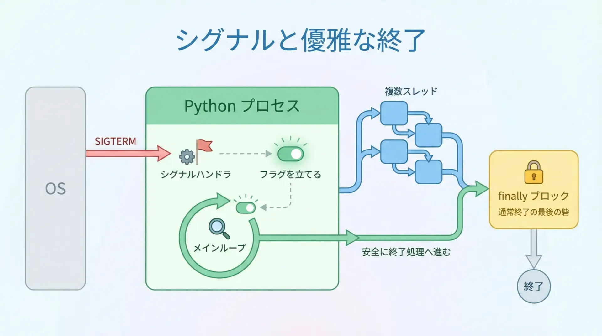 実務では、リソース解放にはwith文を優先し、どうしても必要な場合に限定してfinallyを用いながら、シグナル処理や再開可能な設計と組み合わせて信頼性を高めていくことが重要です。
